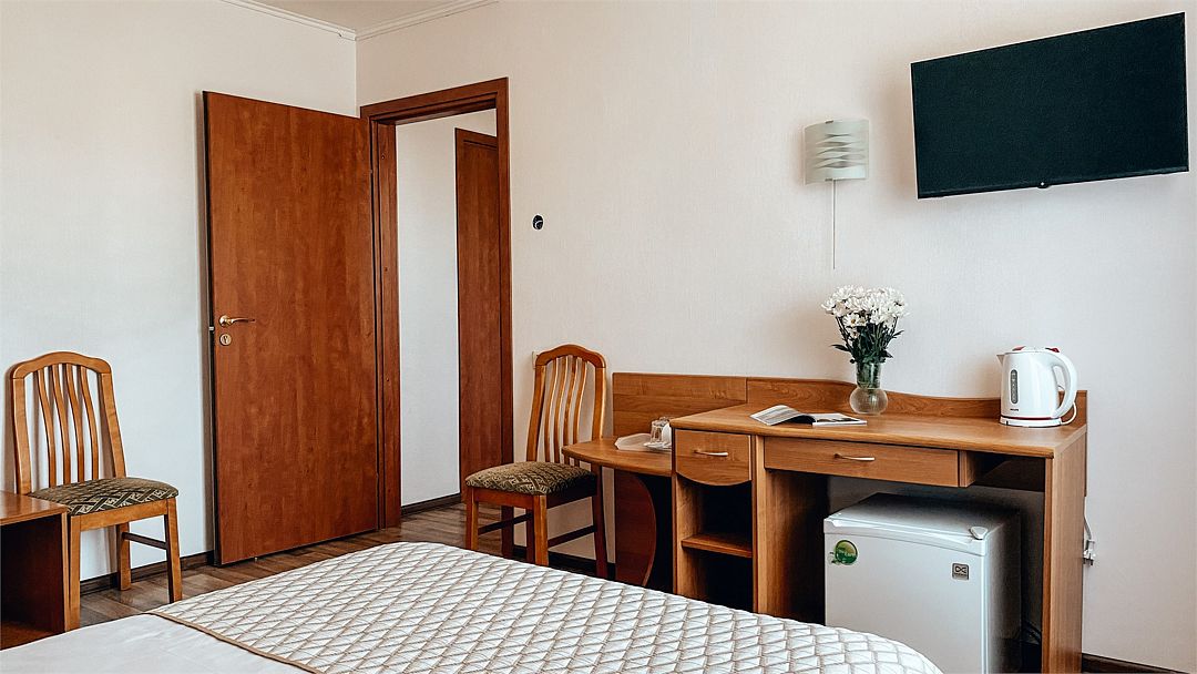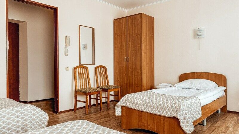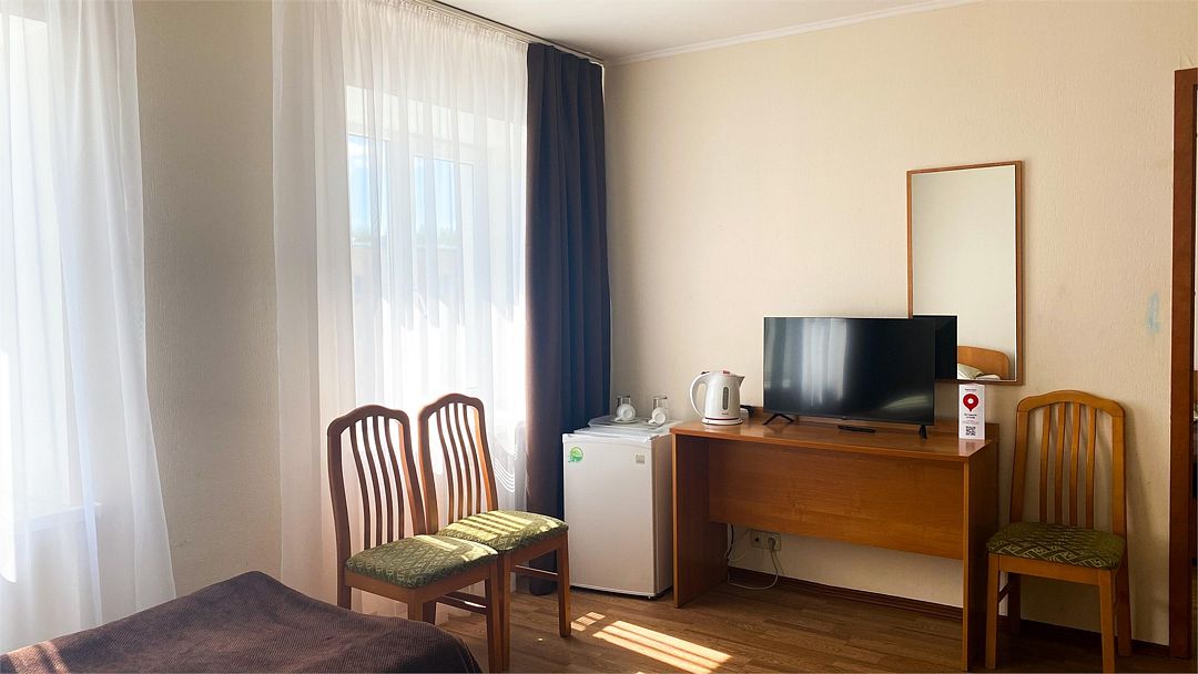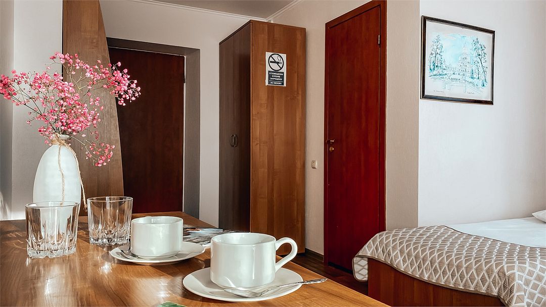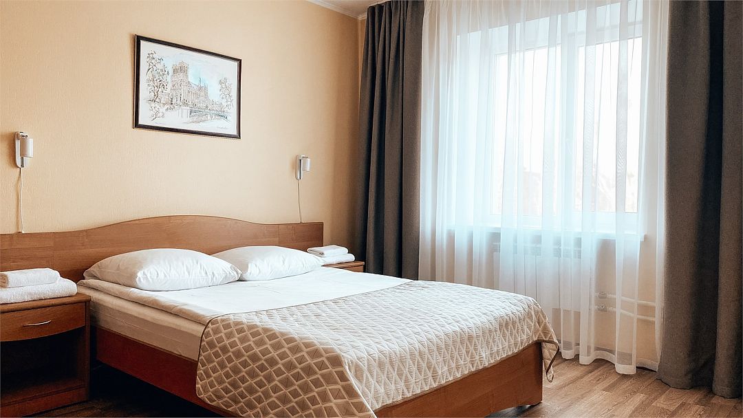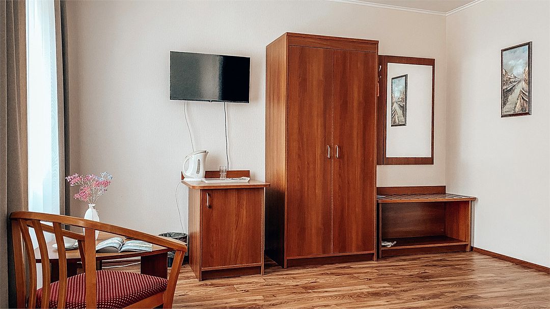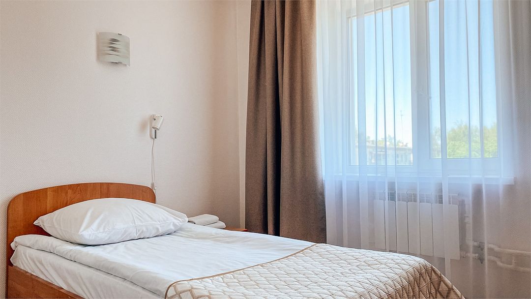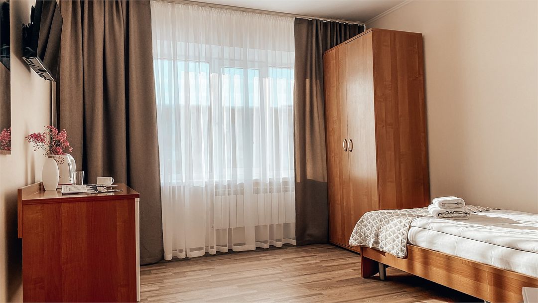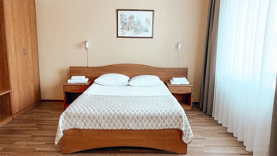 Пятиэтажный корпус отеля расположен на спокойной зеленой улице среди малоэтажной застройки. Гостей ожидают номера разной категории комфорта — Стандарт. Улучшенный, Семейный. В общей сложности жилой фонд готов принять 127 отдыхающих. В каждом номере есть индивидуальная ванная комната, телевизор, мини-холодильник, электрочайник.