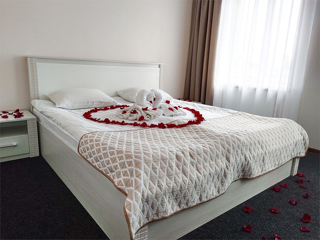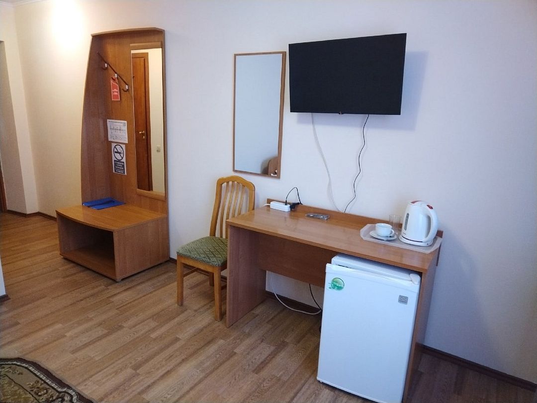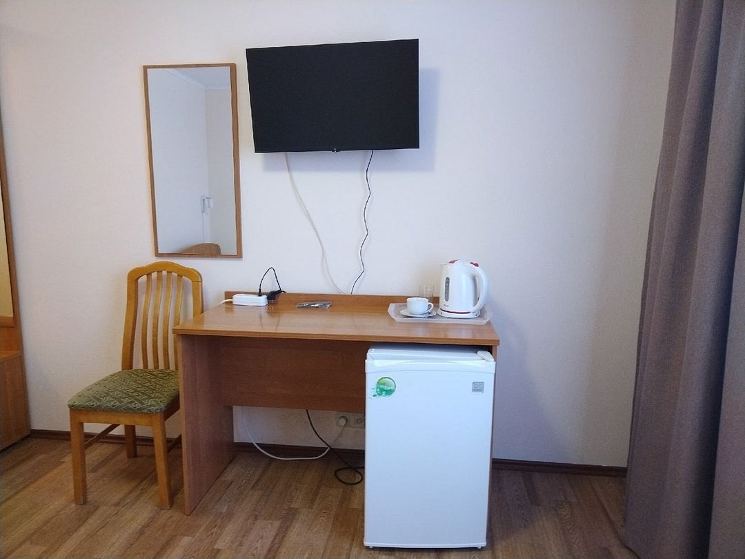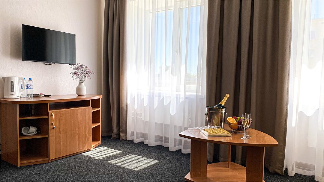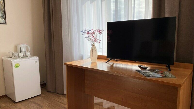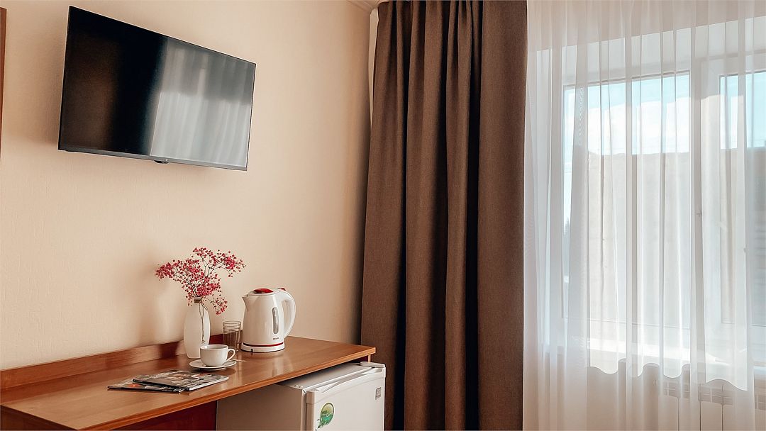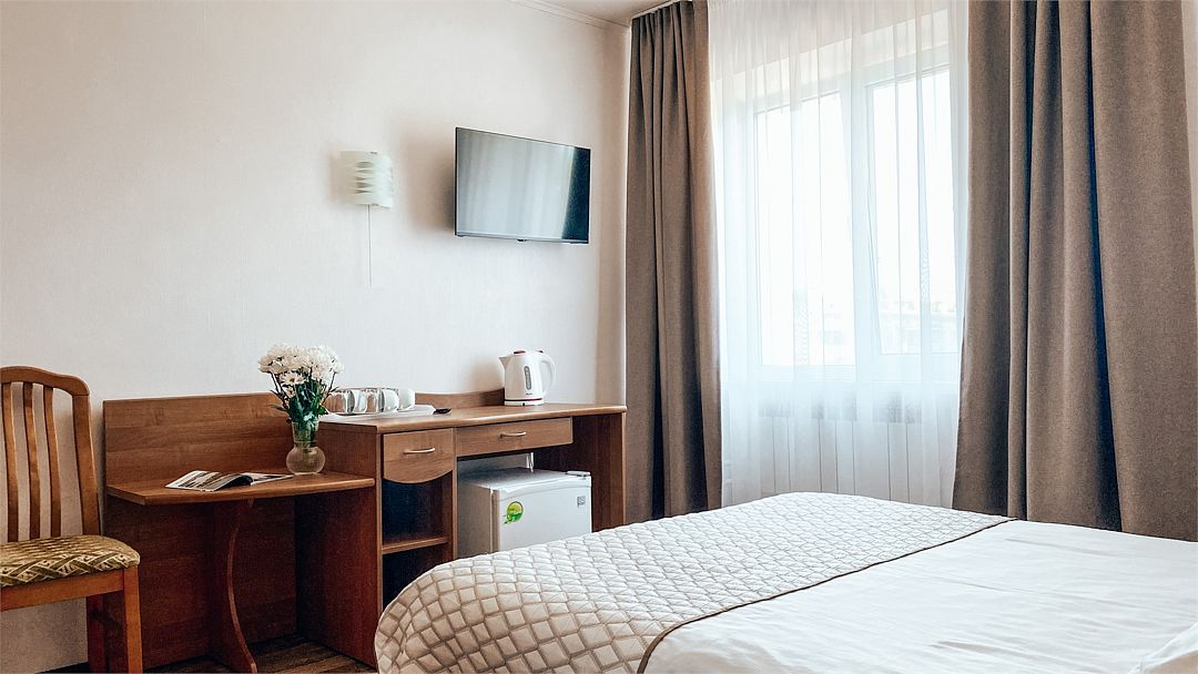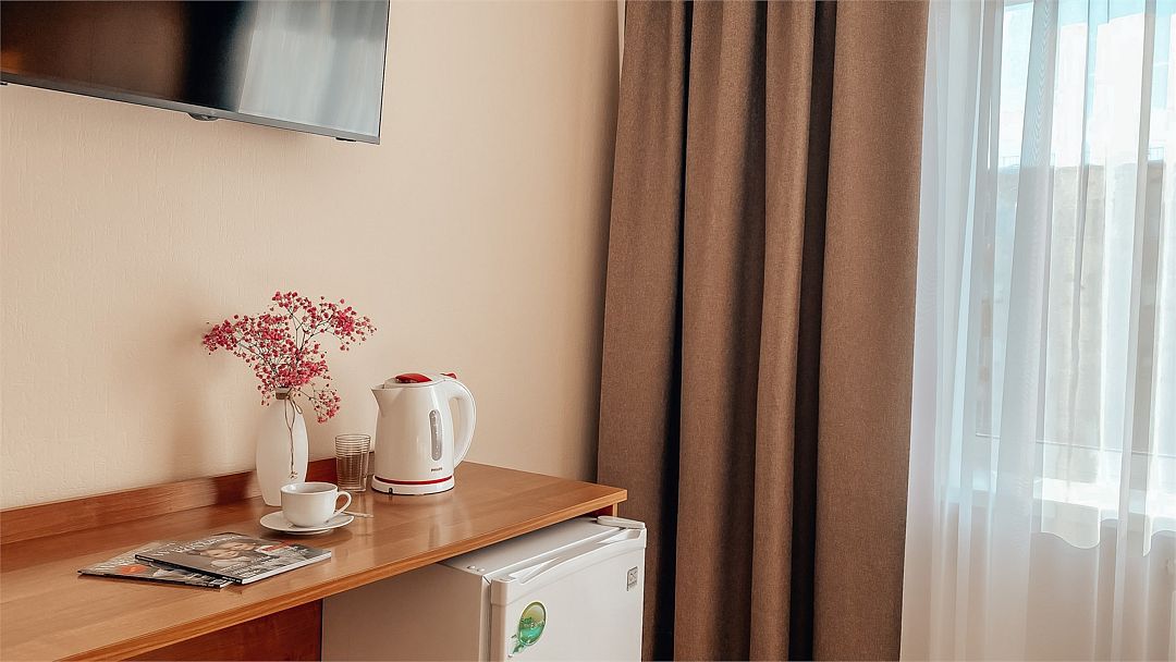 Пятиэтажный корпус отеля расположен на спокойной зеленой улице среди малоэтажной застройки. Гостей ожидают номера разной категории комфорта — Стандарт. Улучшенный, Семейный. В общей сложности жилой фонд готов принять 127 отдыхающих. В каждом номере есть индивидуальная ванная комната, телевизор, мини-холодильник, электрочайник.