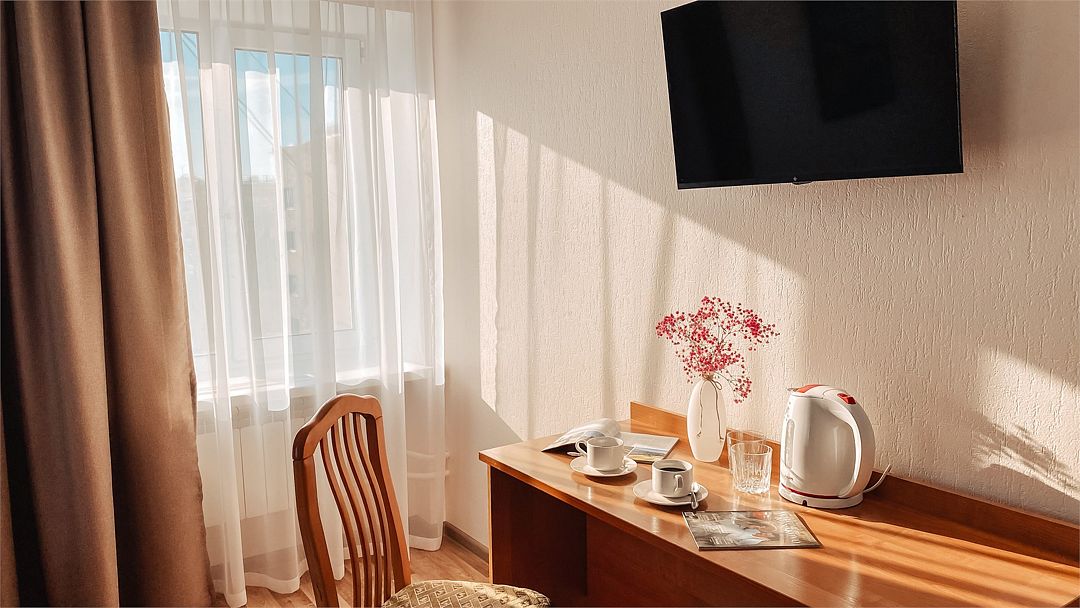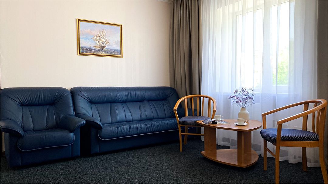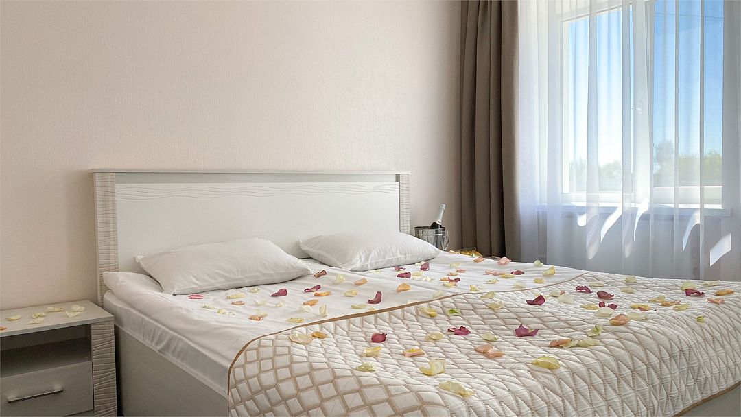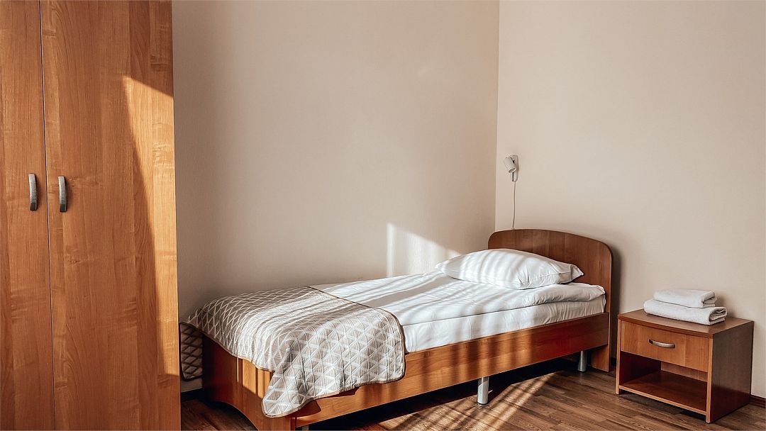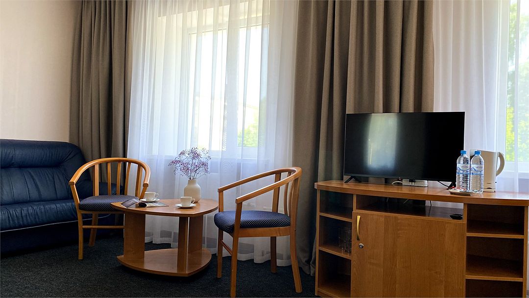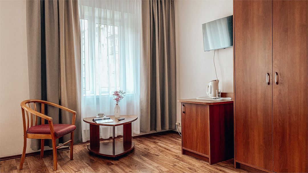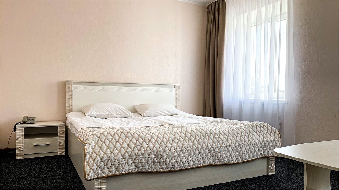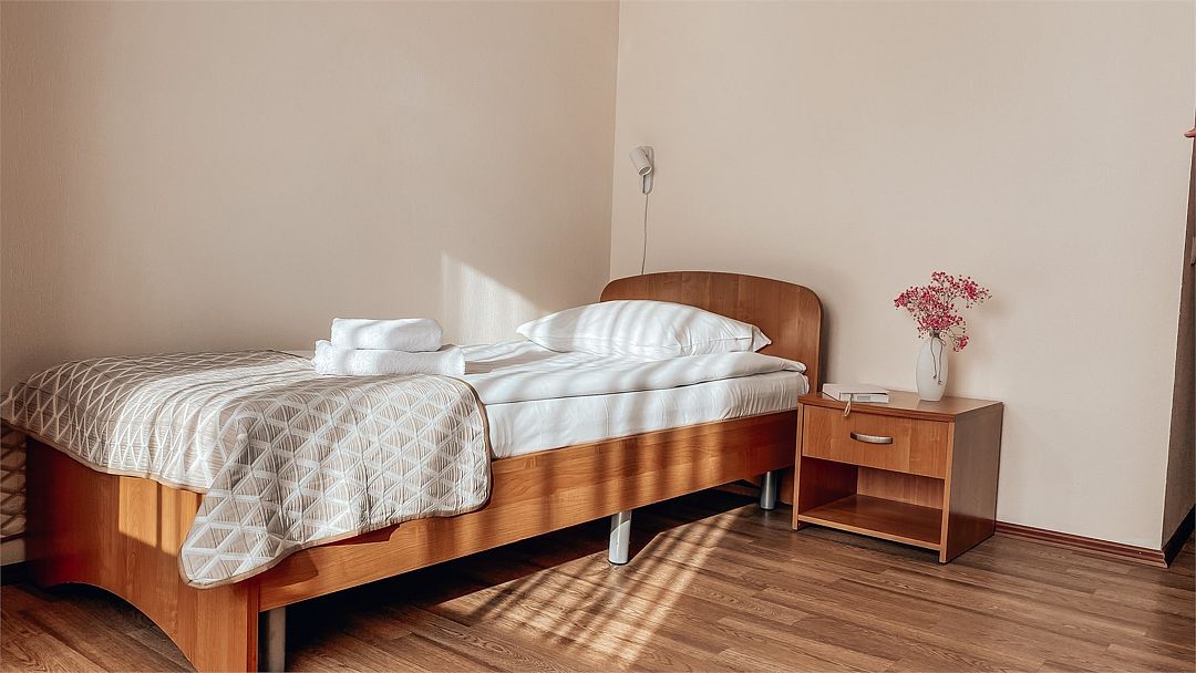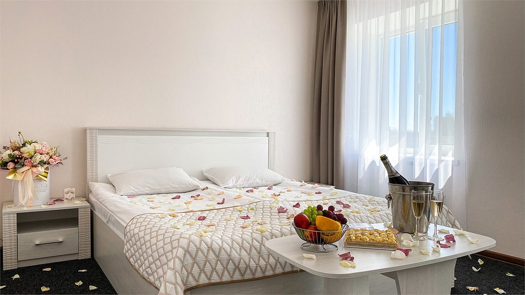 Пятиэтажный корпус отеля расположен на спокойной зеленой улице среди малоэтажной застройки. Гостей ожидают номера разной категории комфорта — Стандарт. Улучшенный, Семейный. В общей сложности жилой фонд готов принять 127 отдыхающих. В каждом номере есть индивидуальная ванная комната, телевизор, мини-холодильник, электрочайник.