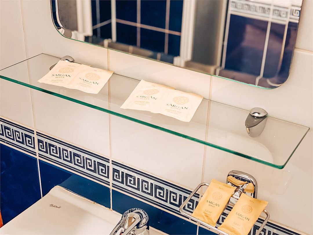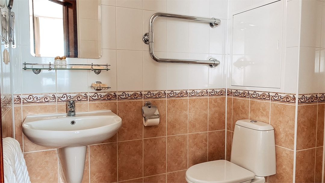 Просторный санузел оснащен всеми необходимыми косметическими средствами.