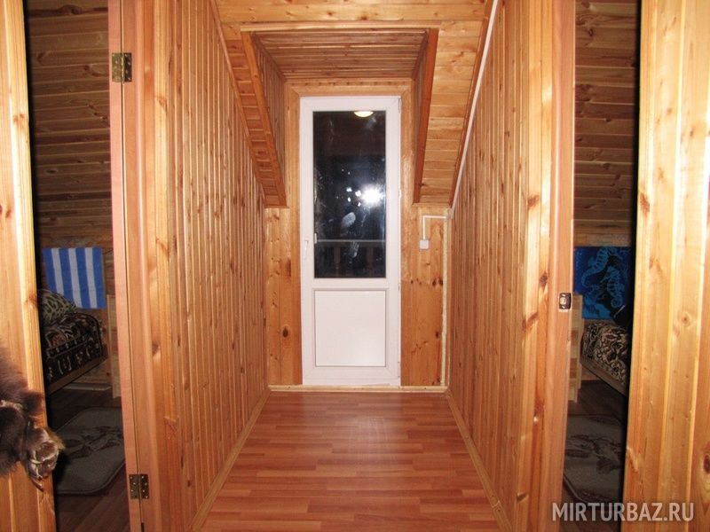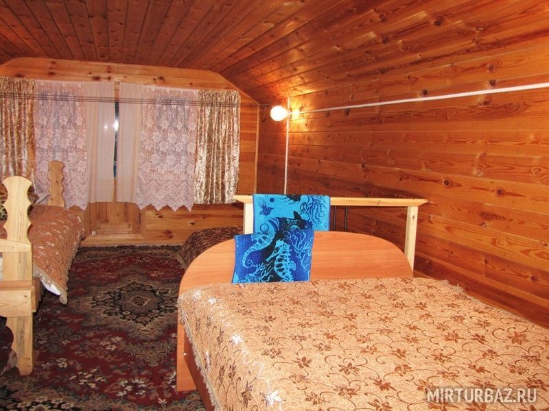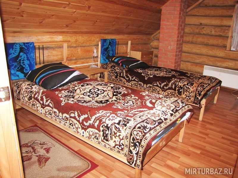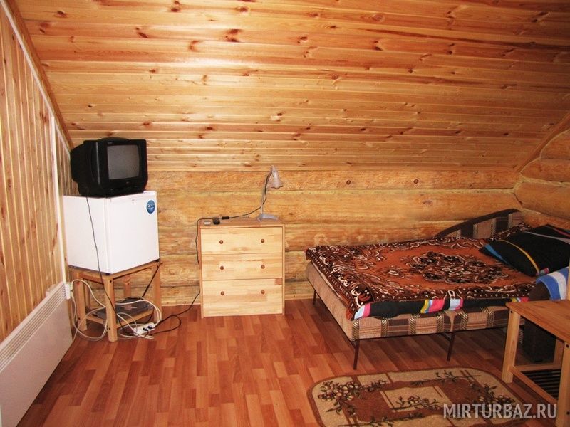 На втором этаже — две трехместных спальных комнаты. В каждом номере: три односпальные кровати, тумбочки, шкаф для одежды, верхний свет, настольные лампы.