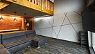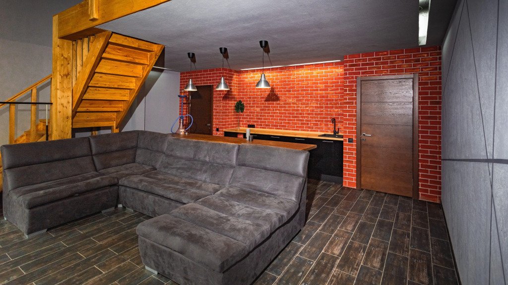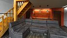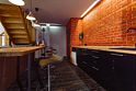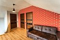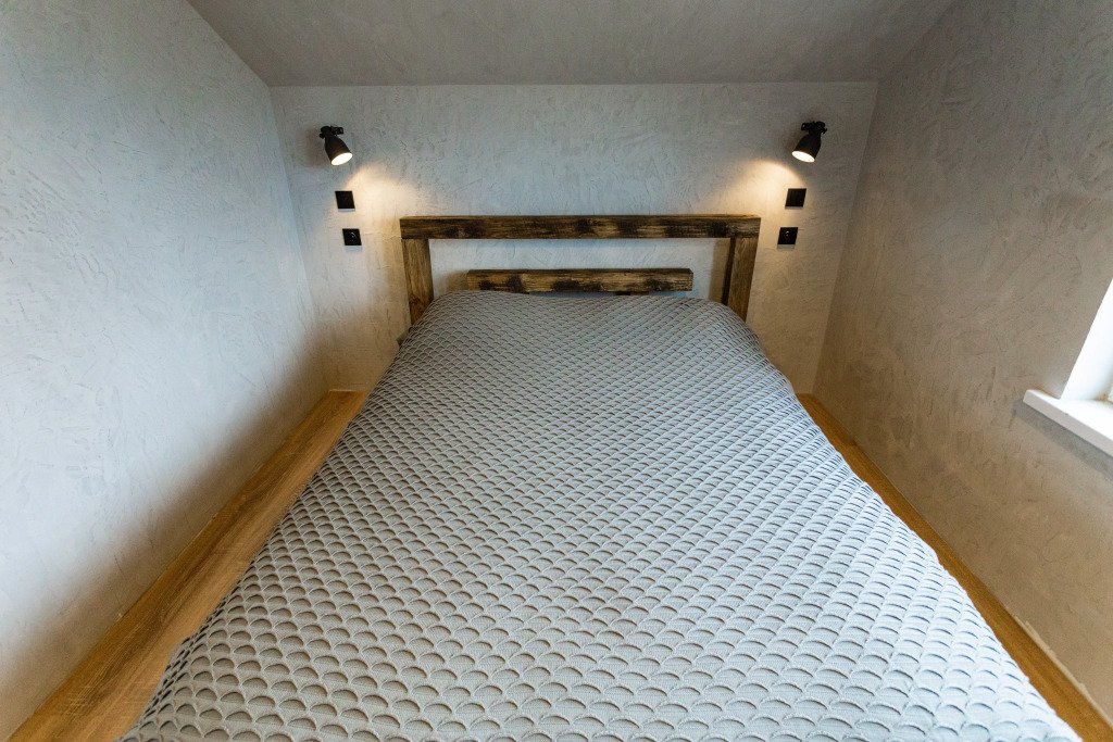 Подходит для размещения до 6 гостей. На первом этаже расположена студия площадью 42 кв. м, душевая, туалет. Есть диван, барный стол и 6 стульев, телевизор. На втором этаже есть просторный балкон второго света 16 кв. м, две спальни по 10 кв м, санузел. Для размещения гостей предоставляются двуспальные кровати, есть два телевизора. Кухня оборудована всей необходимой техникой, есть холодильник, индукционная плита на две конфорки, микроволновая печь, духовой шкаф.