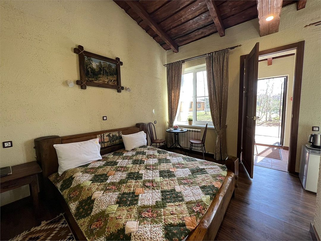 Номер с отдельным выходом и собственной зоной отдыха, в стиле шале, с высокими потолками и потолочными балками. Оснащен 2-спальной кроватью из массива дерева ручной работы с росписями у изголовья.