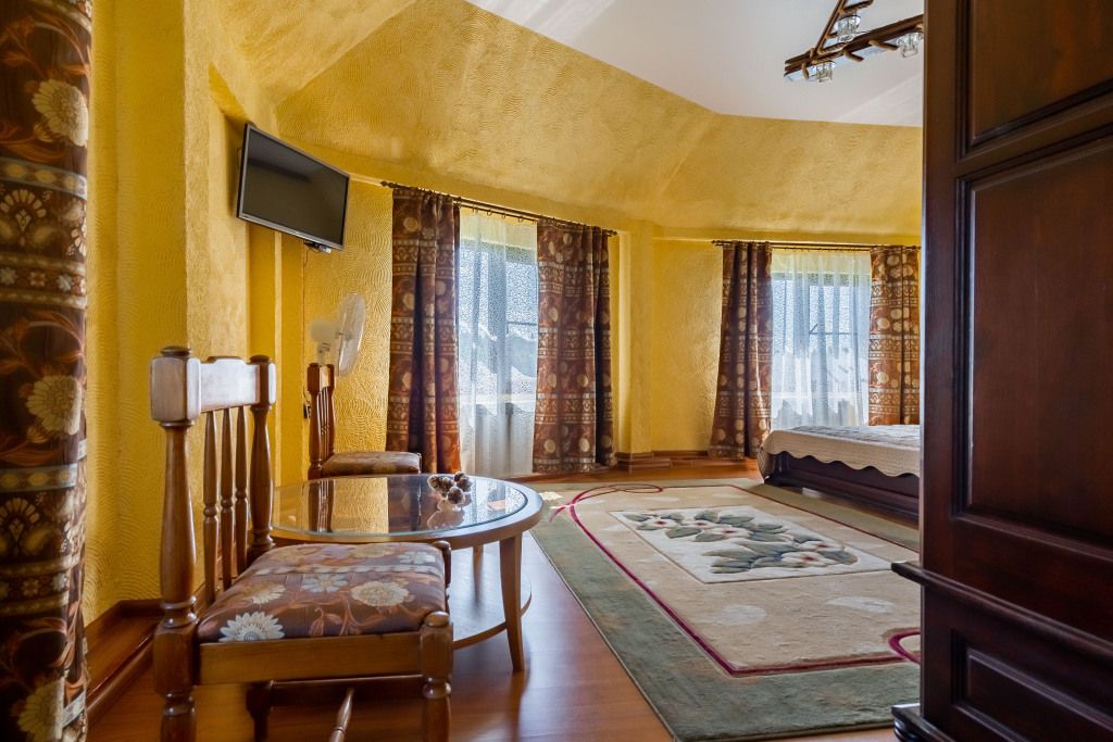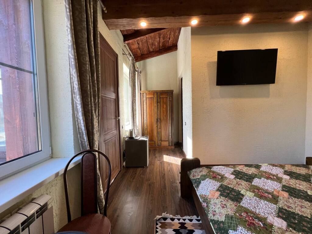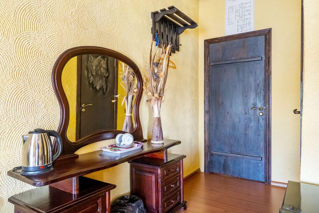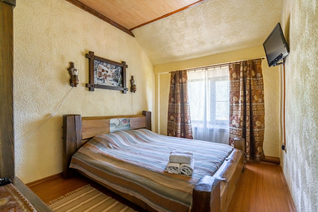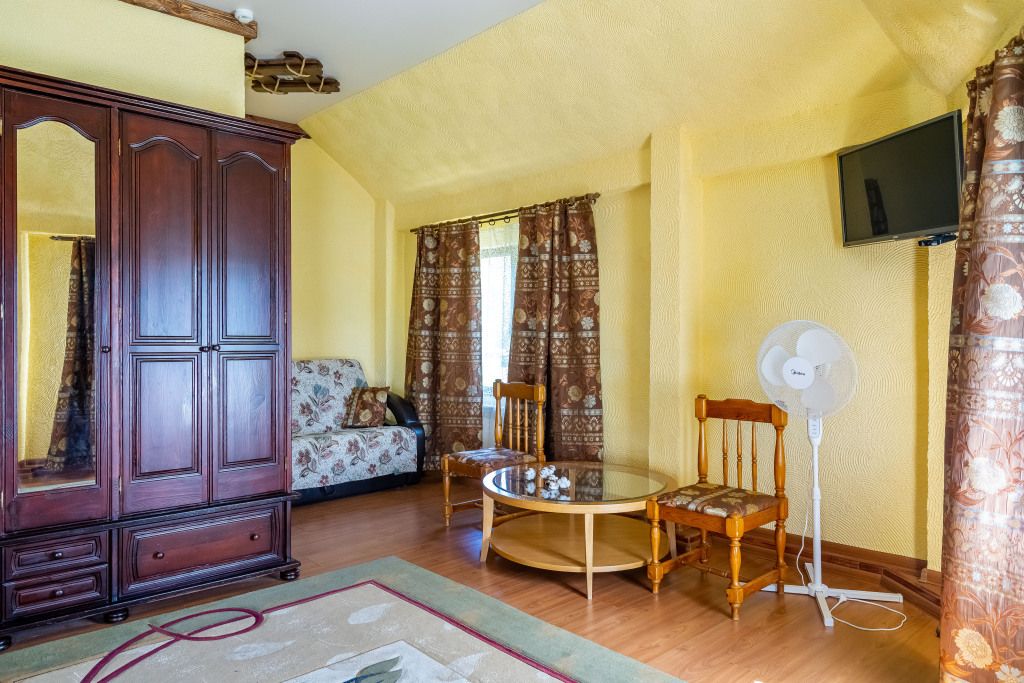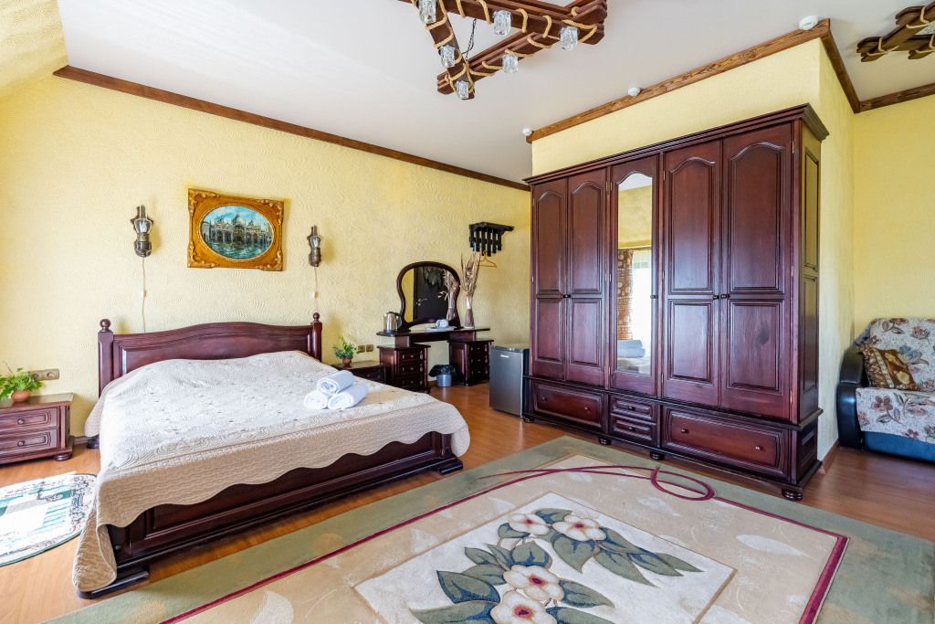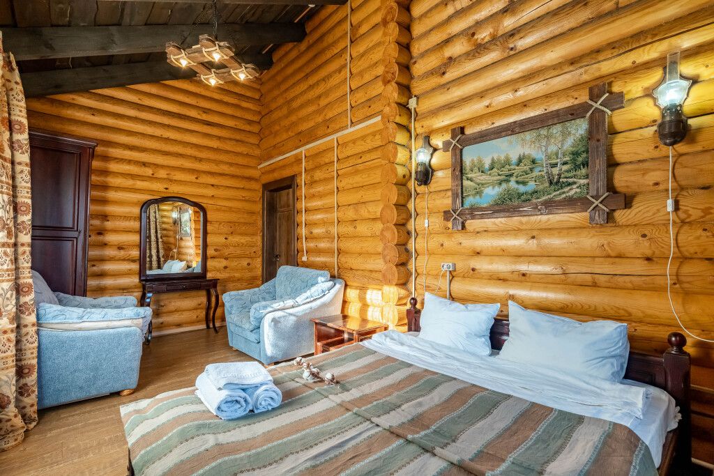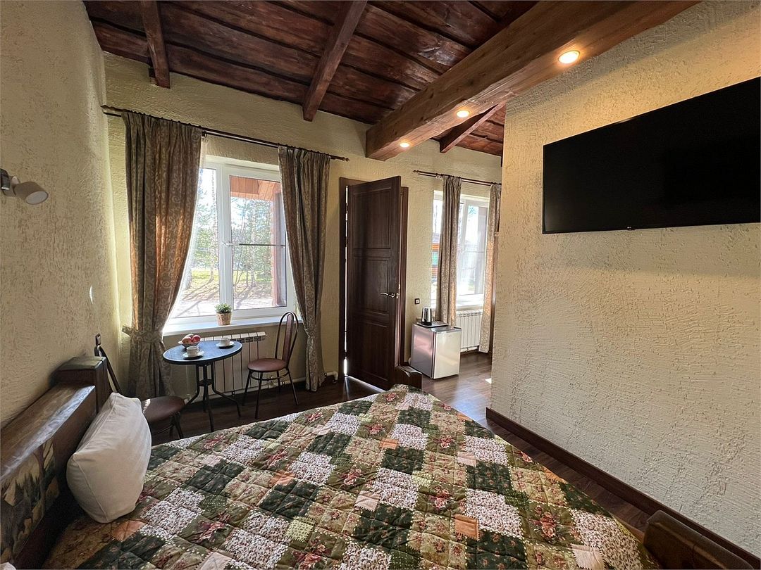В центральном здании на втором этаже номер со всеми удобствами (24 кв.м) с окнами с видом на озеро. В номере спальный гарнитур из массива дерева вишня- двуспальная кровать, шкаф, прикроватные тумбочки, трюмо, диван кровать. Сан узел совмещенный с душевой кабиной.