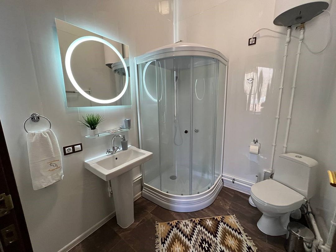 Предоставляется смарт-ТВ, Wi-Fi, холодильник, чайник, посуда. Ванная комната оборудована душевой кабиной, круглосуточная подача горячей и холодной воды. При входе в номер, на улице, имеется площадь для отдыха.