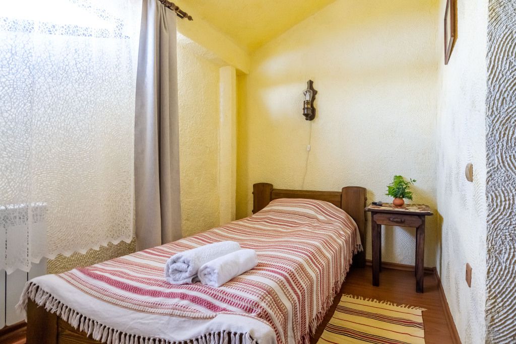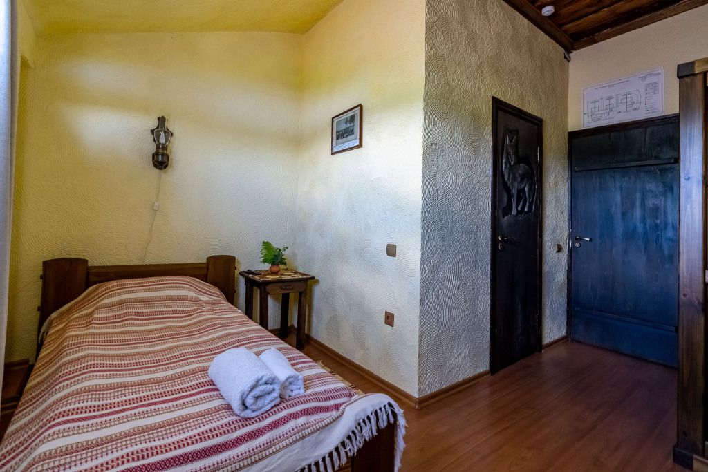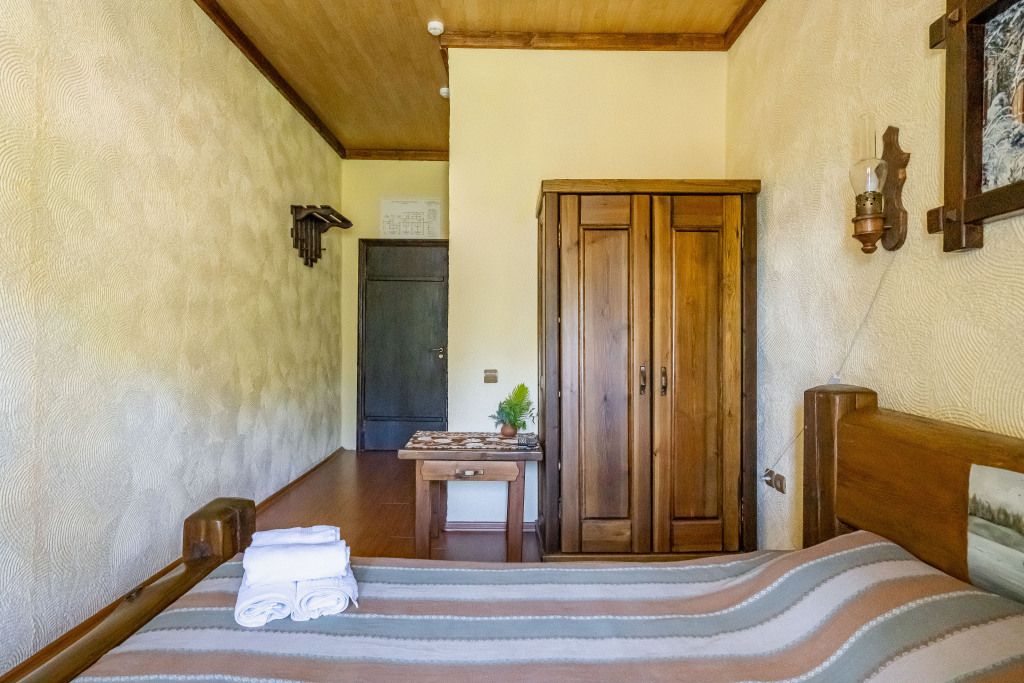 В центральном здании на втором этаже имеются 3 одноместных номера со всеми удобствами (14 кв.м). В номерах мебель из массива дерева- одноместная кровать, шкаф, тумбочка. Сан узел совмещенный с душевой кабиной.