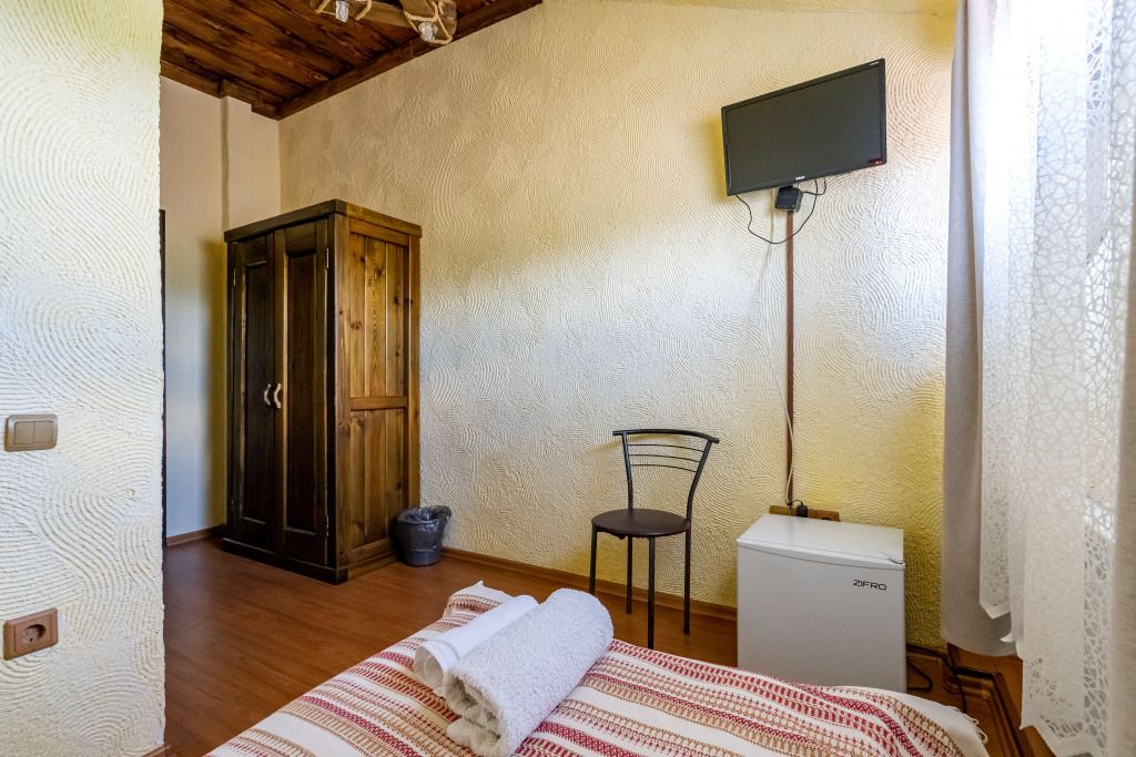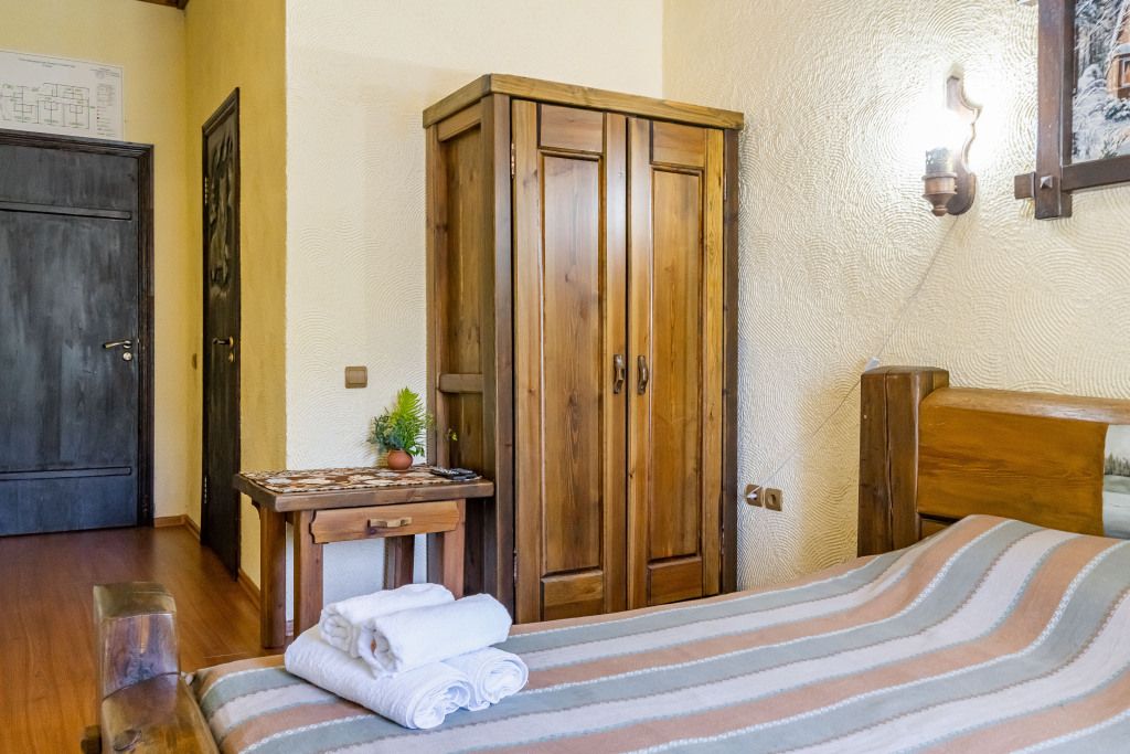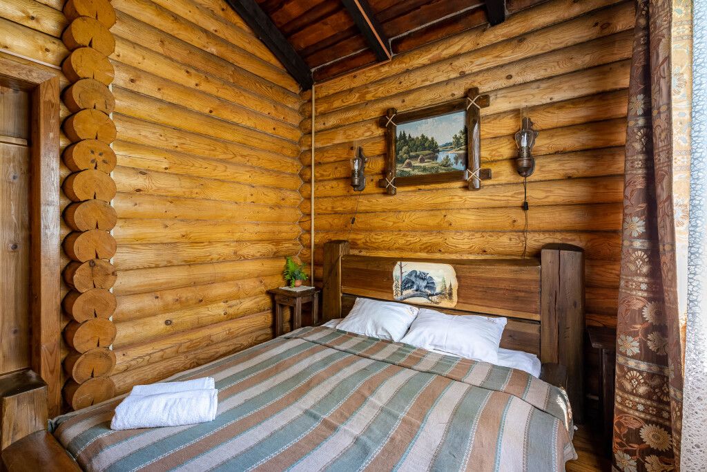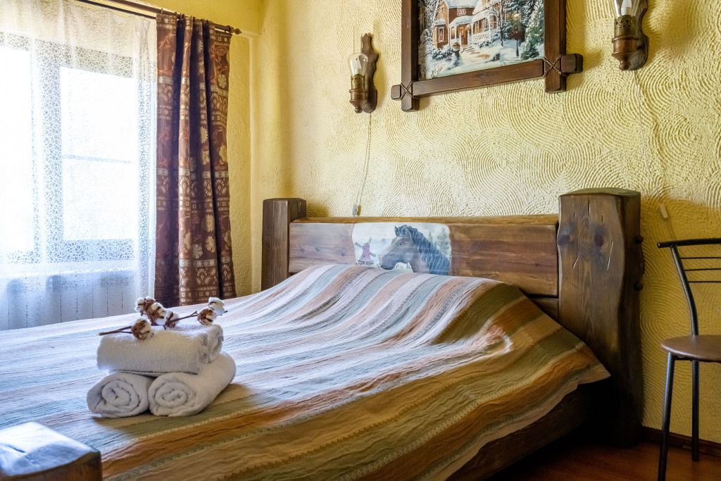 В центральном здании на втором этаже имеются 4 двухместных номера со всеми удобствами (18 кв.м). В номерах мебель из массива дерева- двухспальная кровать, шкаф, тумбочка. Сан узел совмещенный с душевой кабиной.