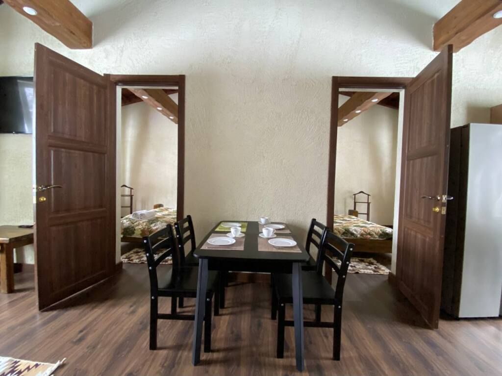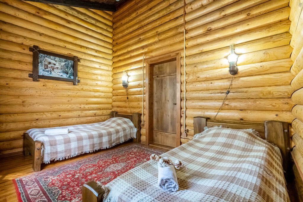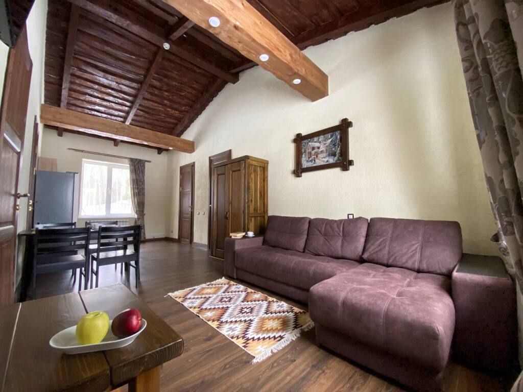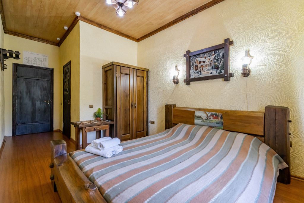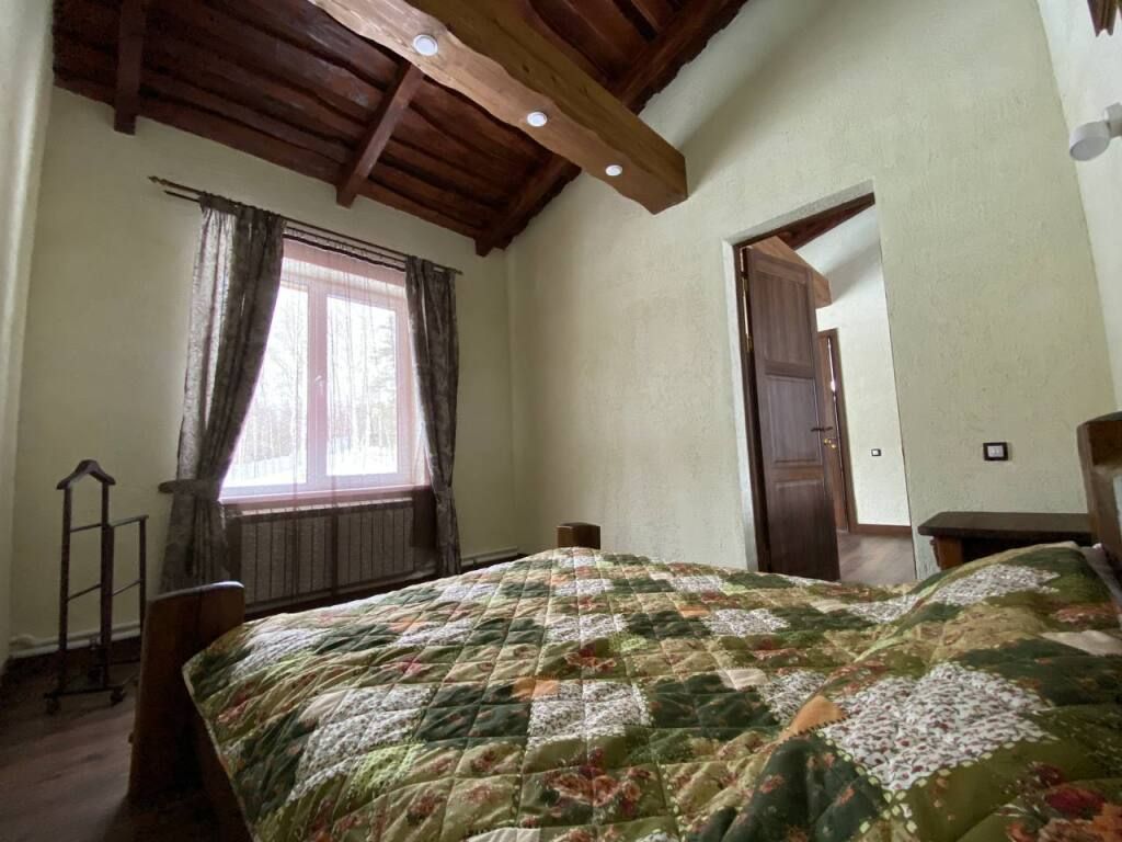 Коттедж в стиле шале с высокими потолками и потолочными балками. Имеются две спальни, в каждой из которых 2-х спальная кровать из массива дерева ручной работы с росписями у изголовья. В гостиной 2-х спальный диван, смарт ТВ, Wi-Fi. В кухонной зоне обеденный стол со стульями, кухонный гарнитур, холодильник, микроволновая печь, чайник, посуда.