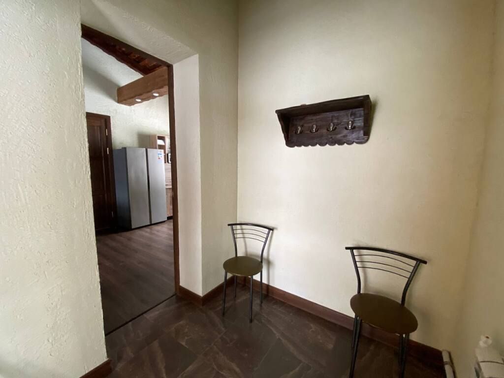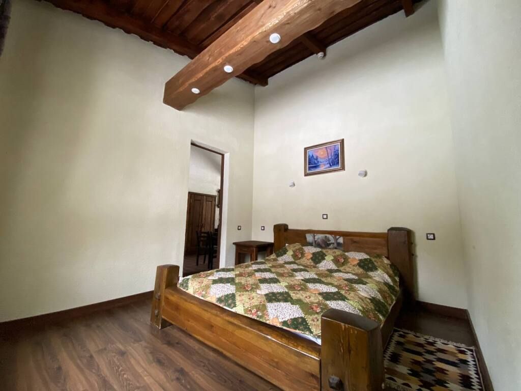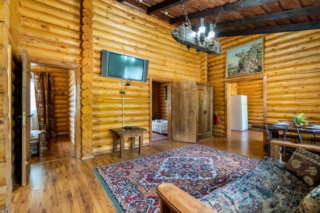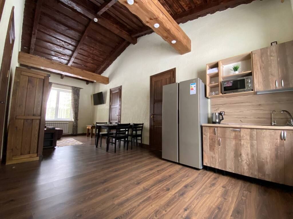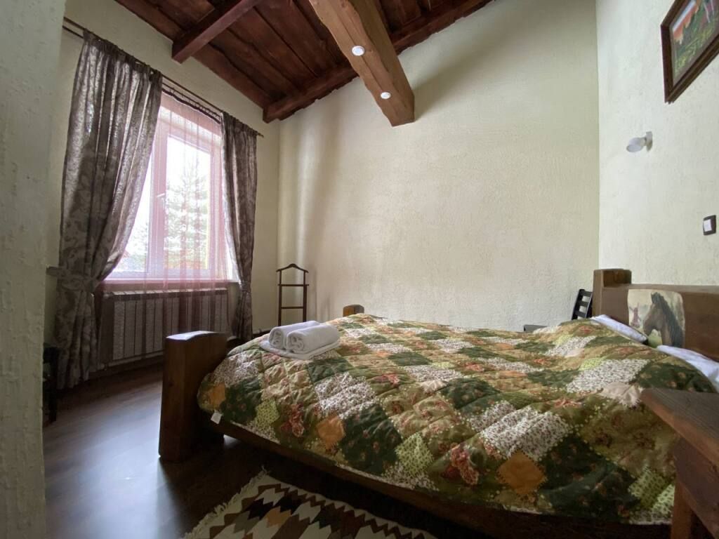 Коттедж в стиле шале с высокими потолками и потолочными балками. Имеются две спальни, в каждой из которых 2-х спальная кровать из массива дерева ручной работы с росписями у изголовья. В гостиной 2-х спальный диван, смарт ТВ, Wi-Fi. В кухонной зоне обеденный стол со стульями, кухонный гарнитур, холодильник, микроволновая печь, чайник, посуда.