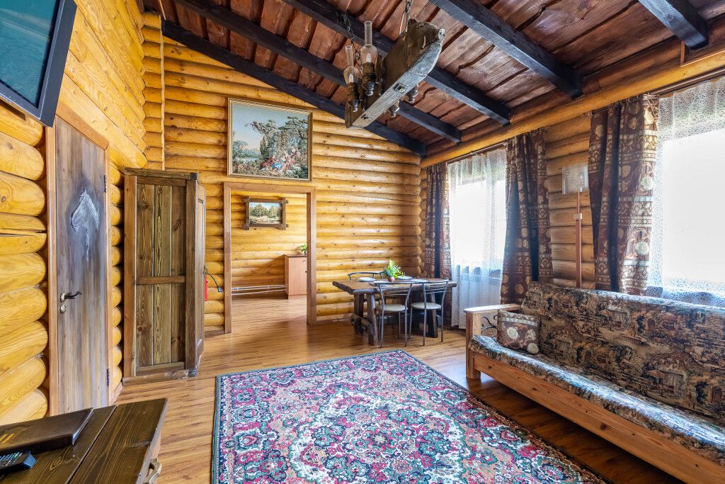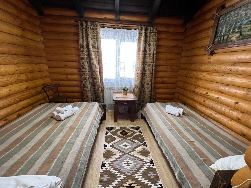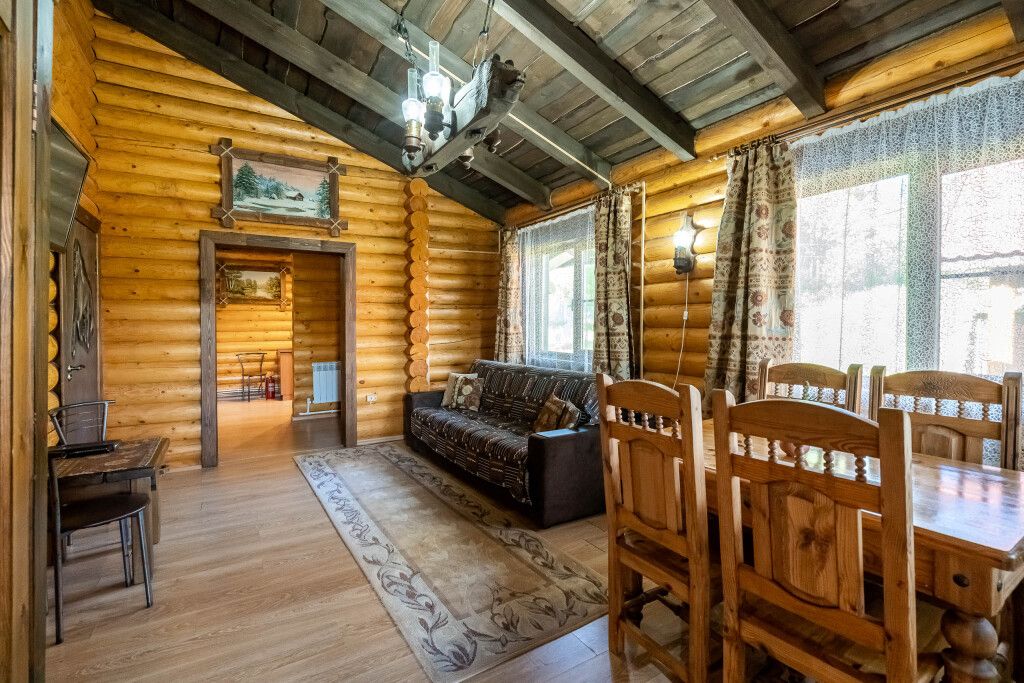 Гостевой дом из бруса со всеми удобствами, состоящий из двух спален, гостиной, кухни, сан узлом. Оснащен мебелью из массива дерева, ЖКТ телевизором 20 каналов, душевой кабиной, современной сантехникой и мебелью из массива дерева. В одной спальне двуспальная кровать во второй две односпальные кровати. В гостиной диван кровать с обеденным столом. Кухня оснащена холодильником, микроволновой печью, посудой. Горячая и холодная вода подается круглосуточно. У дома установлен беседка с мангалам и качелями.