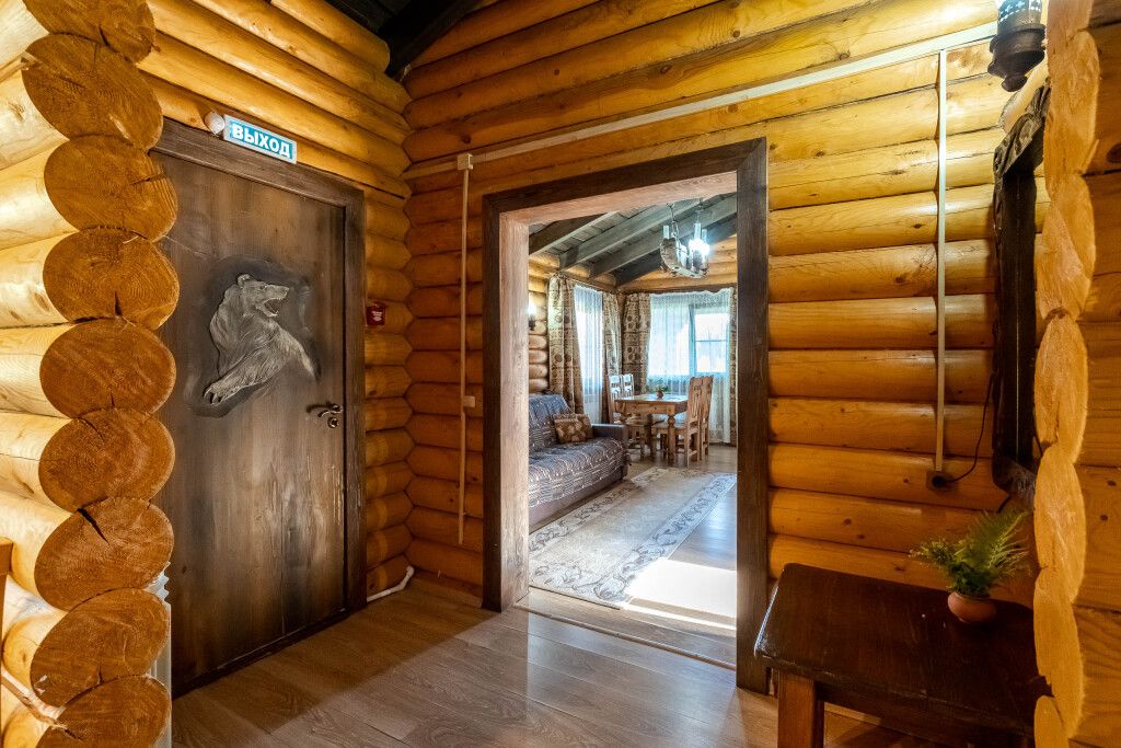 Банкетный зал имеет лесной дизайн: отделка потолка выполнена из настоящего бруса, вдоль стен расставлены фигуры резных животных. Люстры также ручной работы.Лесной трактир