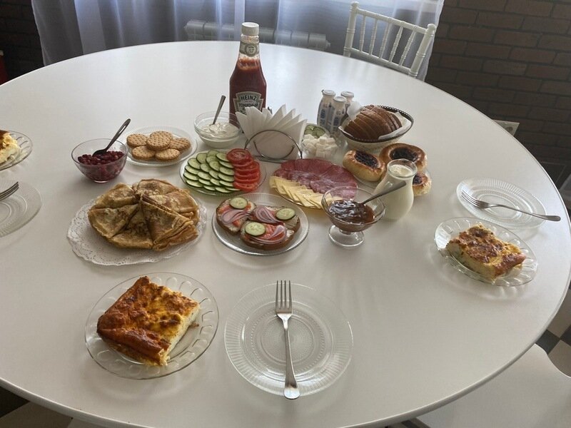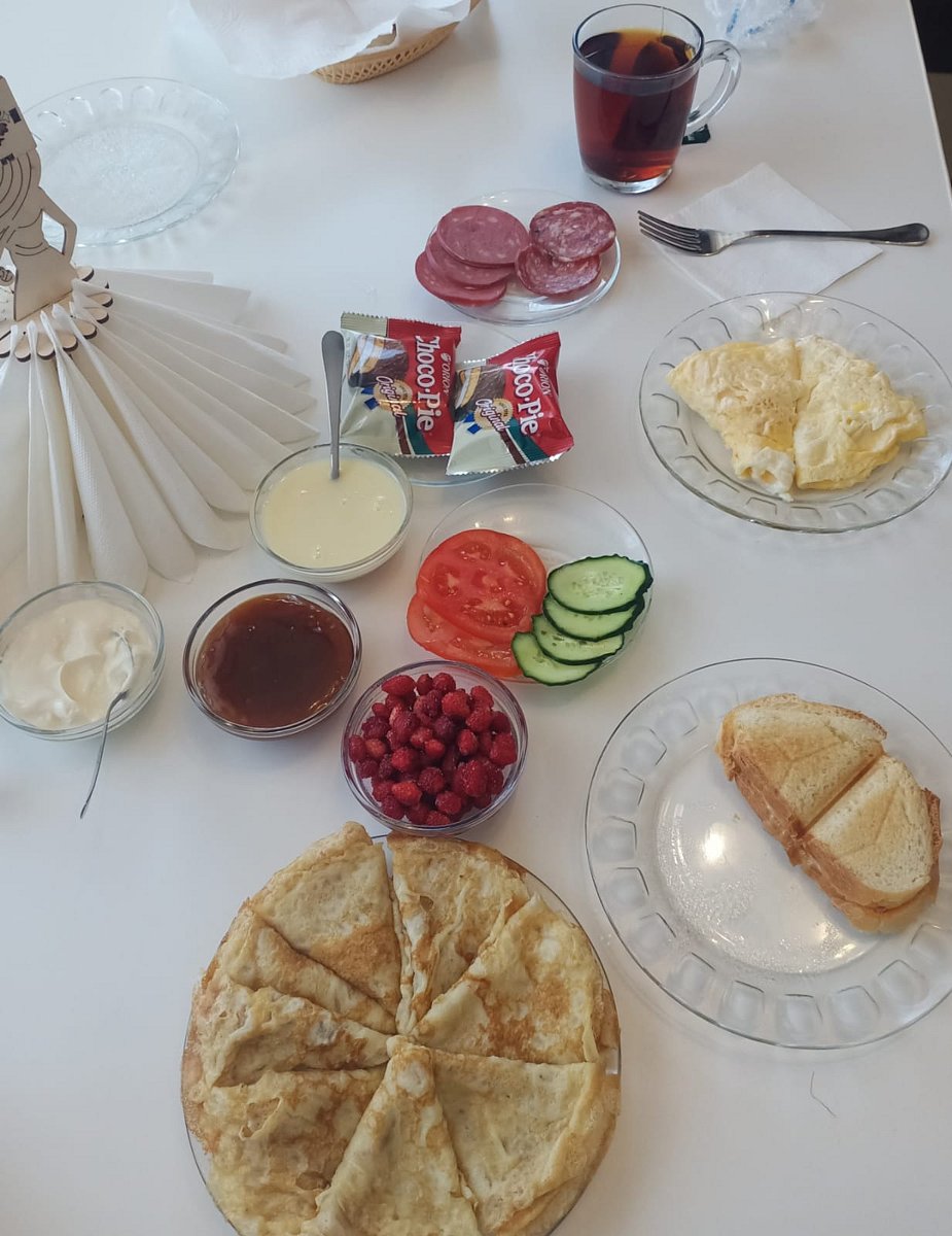 На завтрак обычно каша, на натуральном молоке с фермы, омлет из домашних яиц, блины с вареньем и ягодами. Зерновой кофе с натуральным коровьим молоком. Вкусный и ароматный чай.