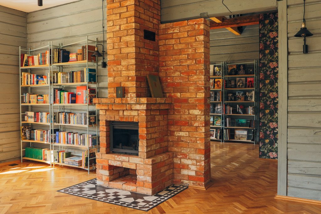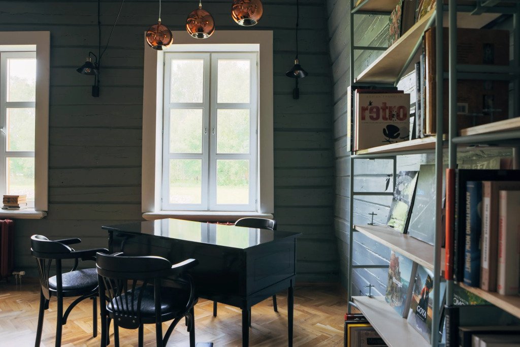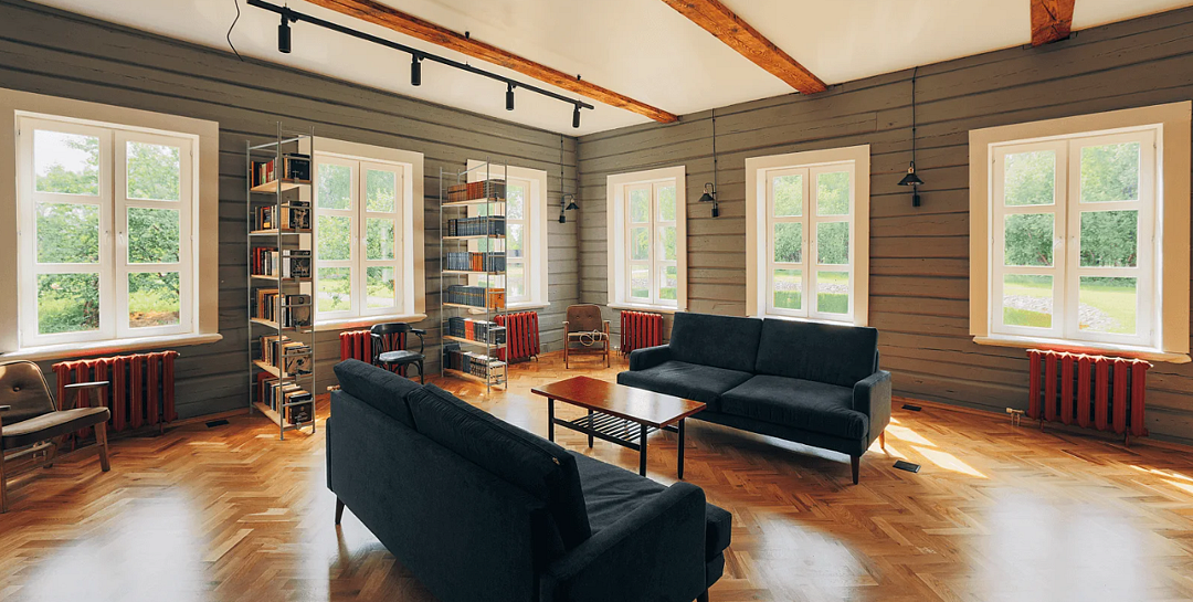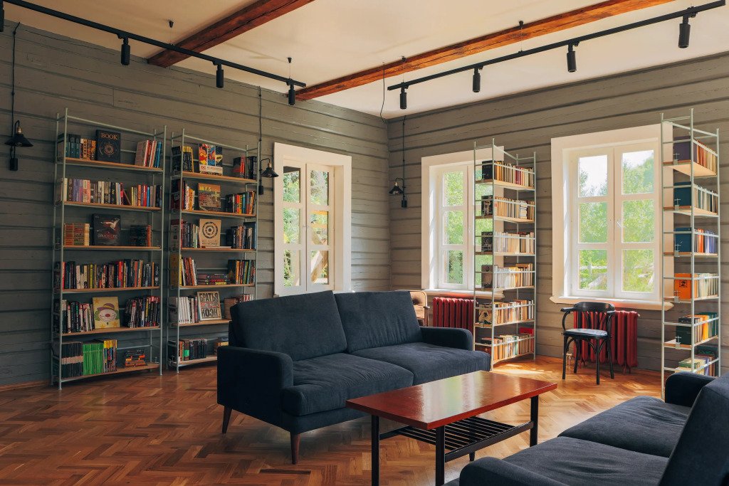 Центральным объектом гостиничного комплекса является библиотека в восстановленной сельской школе 1898 года постройки.