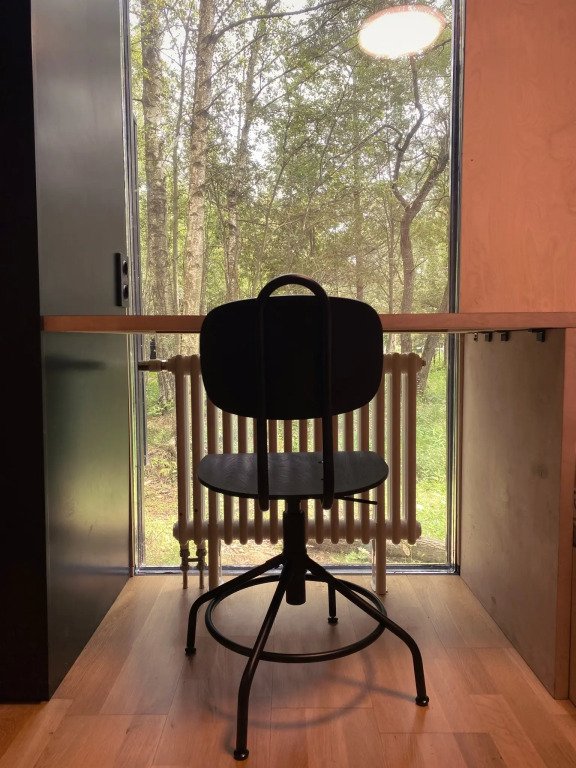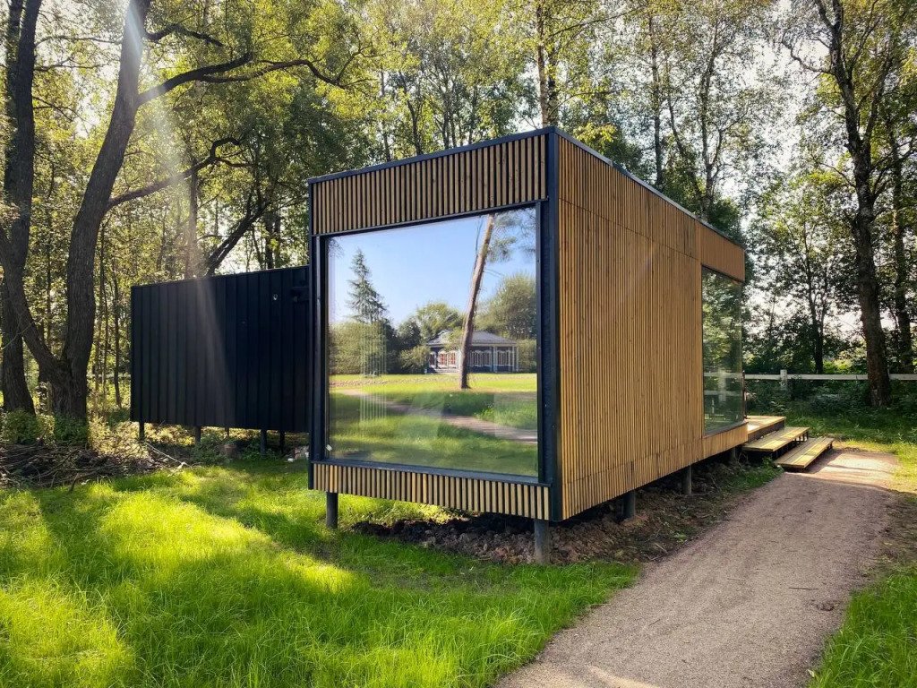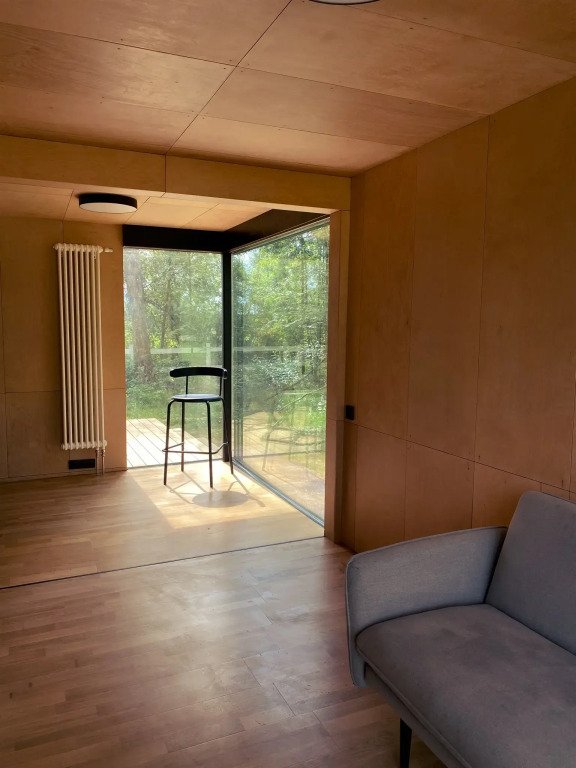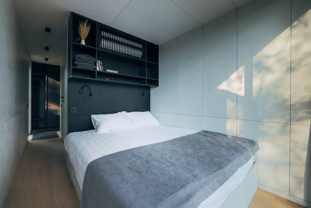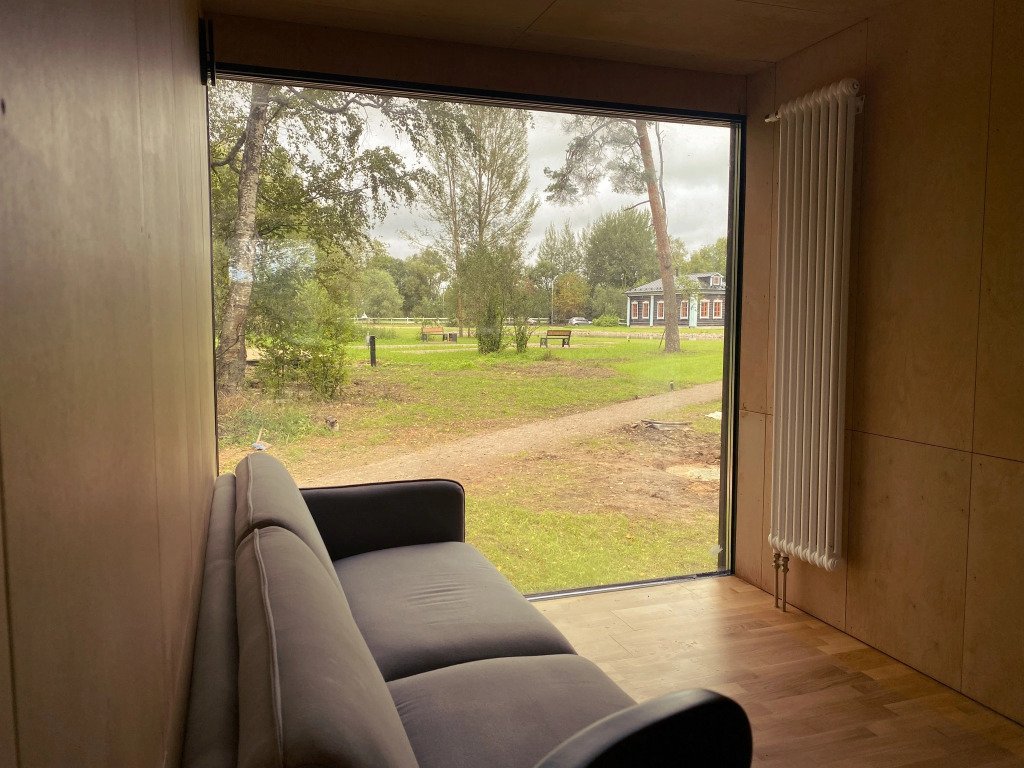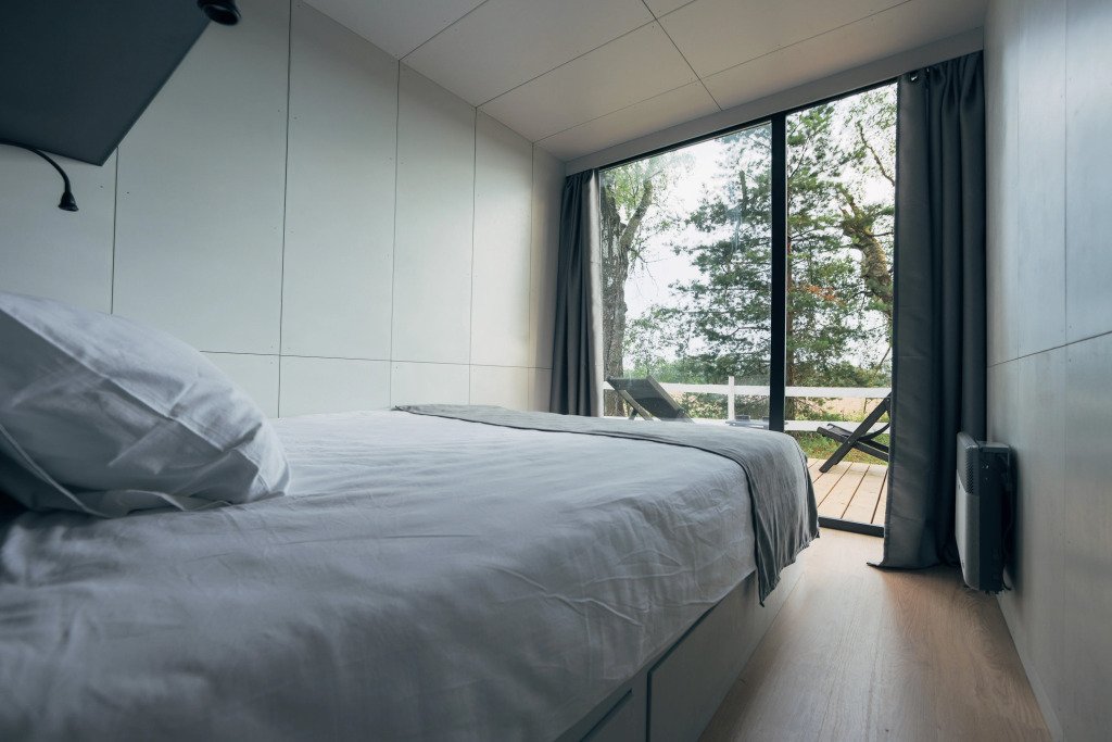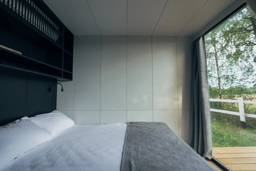 Здесь есть кровать 160 см, мини-холодильник, кофемашина и чайник. Ванная комната с туалетом, душевой кабиной и сушилкой для полотенец. В домике установлены кондиционер и обогреватель, поэтому летом здесь не будет жарко, а зимой - холодно.