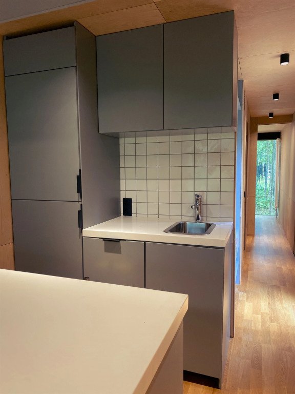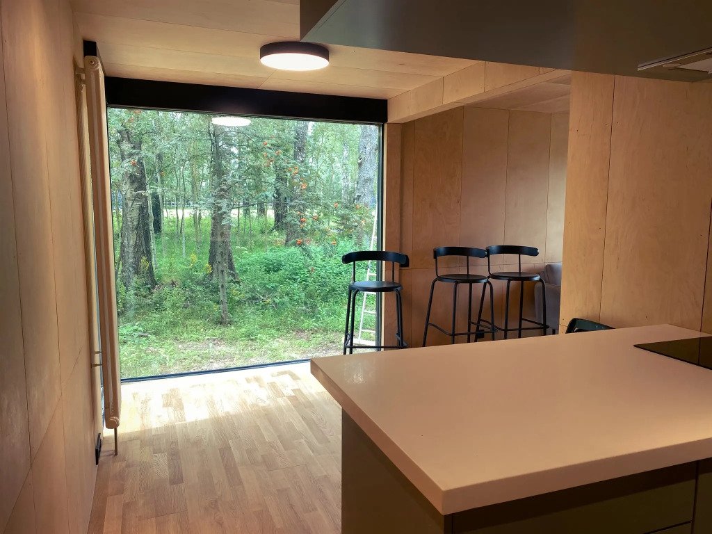 В гостиной обустроен кухонный уголок с мини-холодильником, электроплитой на две конфорки, мойкой, чайником, микроволновой печью и стиральной машиной. Ванная комната с туалетом, душевой кабиной и тёплым полом. В доме установлены кондиционер и обогреватель, поэтому летом здесь не будет жарко, а зимой - холодно.