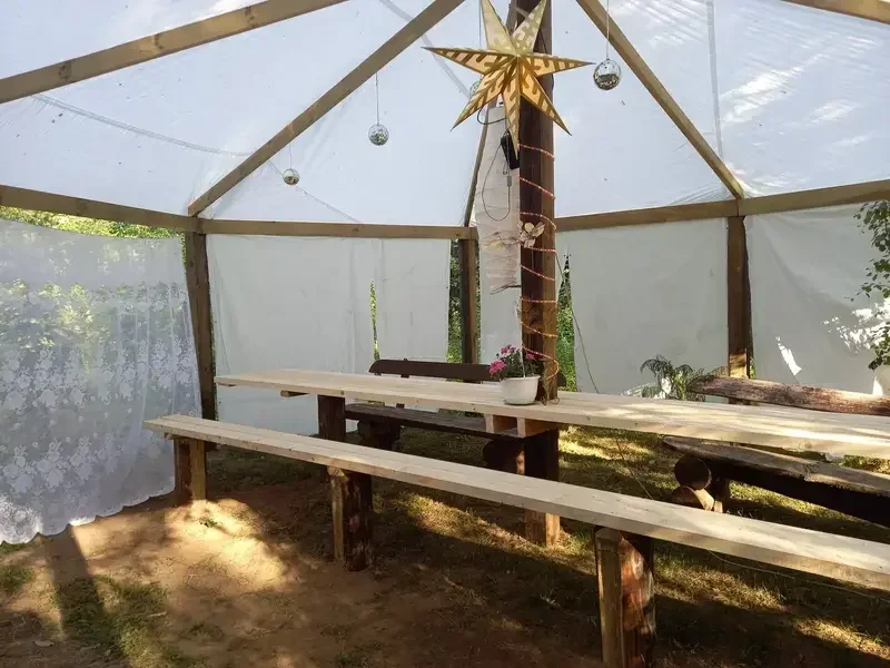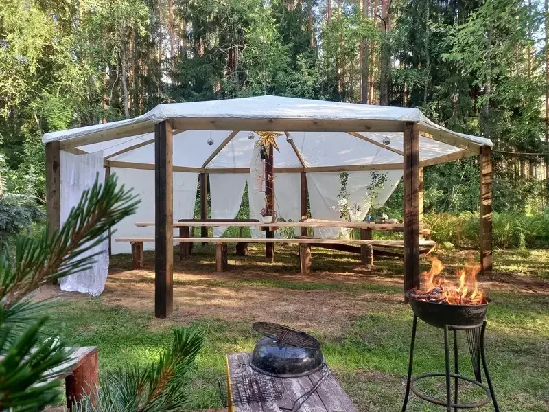 К вашим услугам большой шатер с качелями, гамаками, мангалом, для свадеб, юбилеев и просто вечеринок.