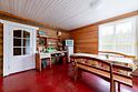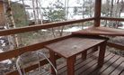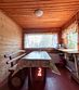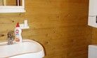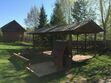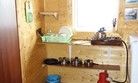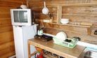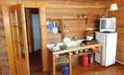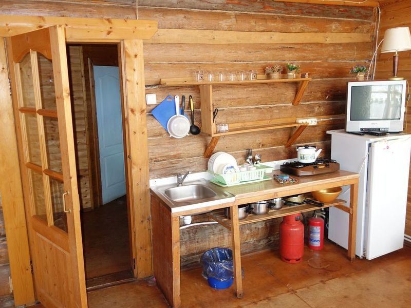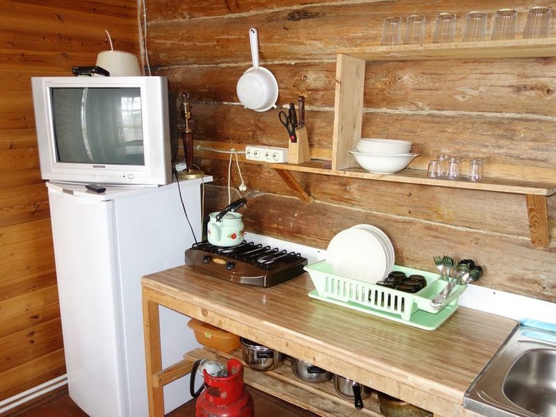 - Мини кухня оборудованная с набором посуды, холодильник, газовая плитка, деревянный стол со скамьями.