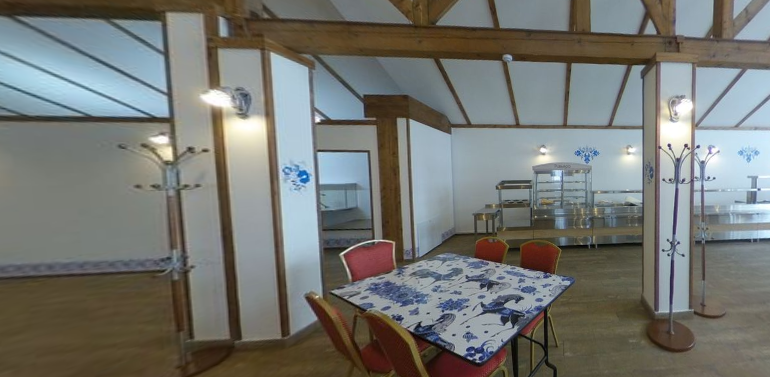 Большой центральный холл площадью 12 метров включает в себя мини-кухню с микроволновой печью, газовой плитой, холодильником, набором необходимой посуды и столовых приборов.