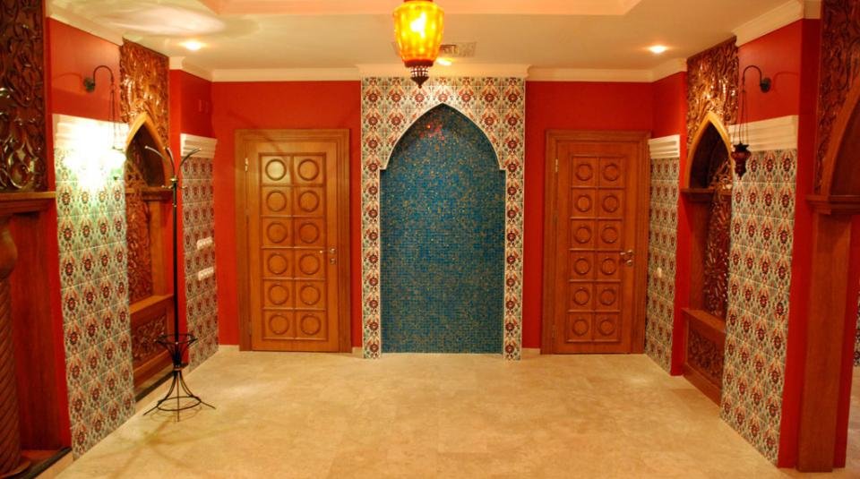 Традиционная современная восточная баня. Расчитана на 10 человек. Парилка отделана турецким мрамором, отделка материалами из Турции. Купель, комната отдыха, санузел, душевая. Все в выполнено восточном стиле.