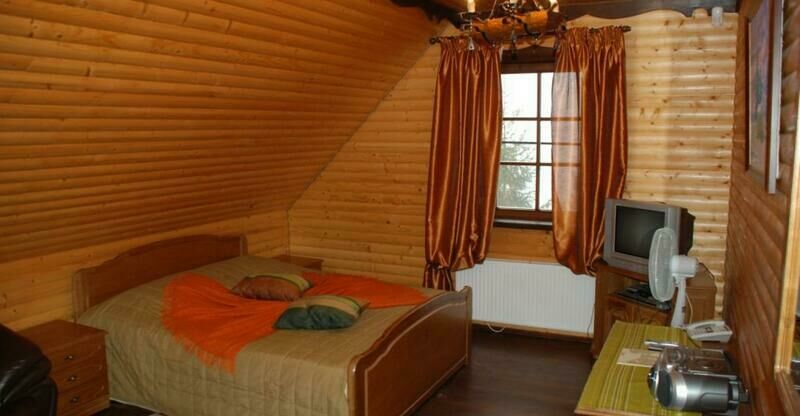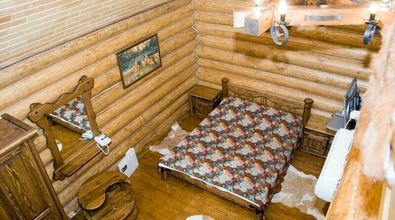 Номер в охотничьих срубах оборудован двуспальной кроватью и всем необходимым для комфортного отдыха.