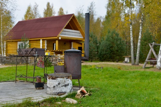 Терраса с уличной мебелью. Отопление в доме комбинированное: электроконвекторы. У дома своя мангальная зона, казан, коптильня