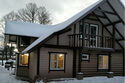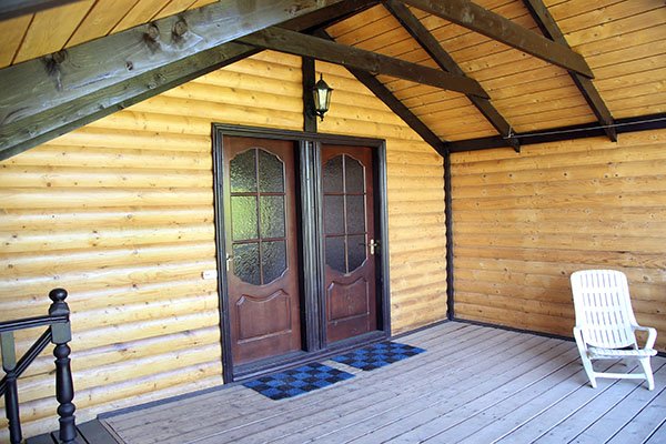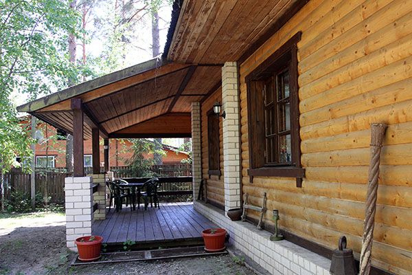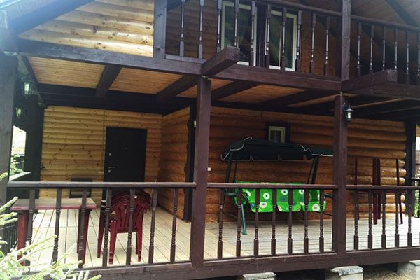 Большой двухэтажный бревенчатый коттедж с широкой крытой террасой по фасаду и камином в холле. На территории - мангал.