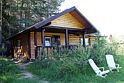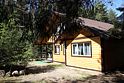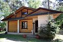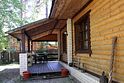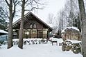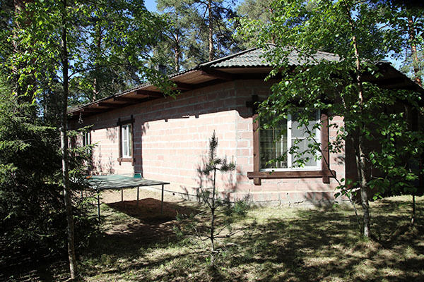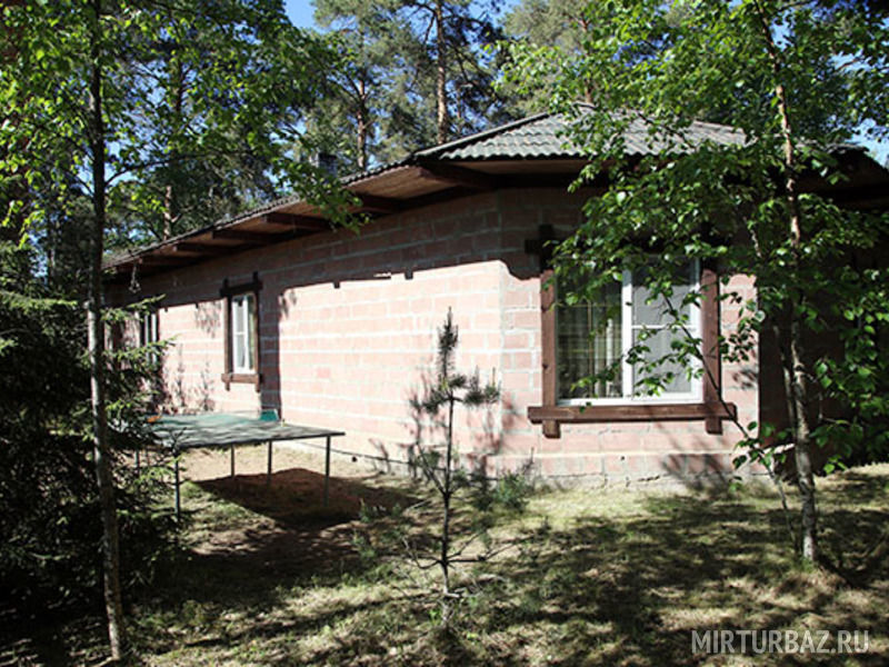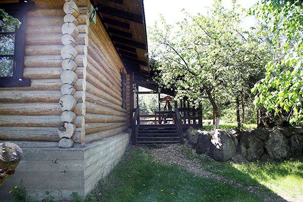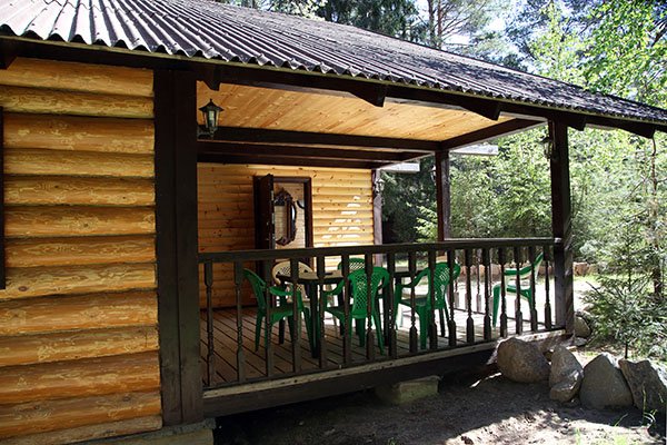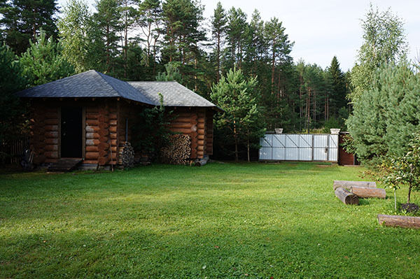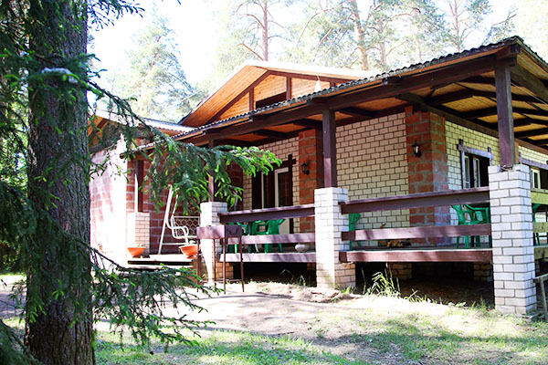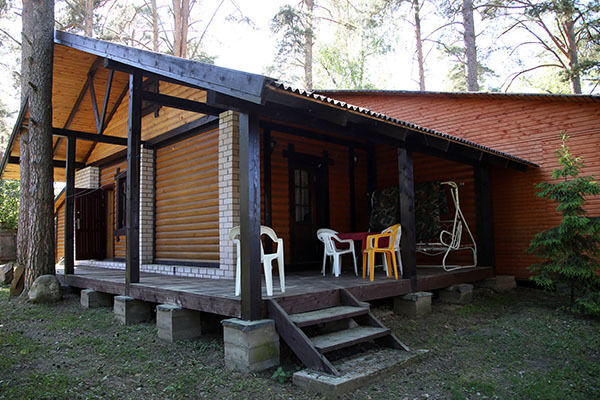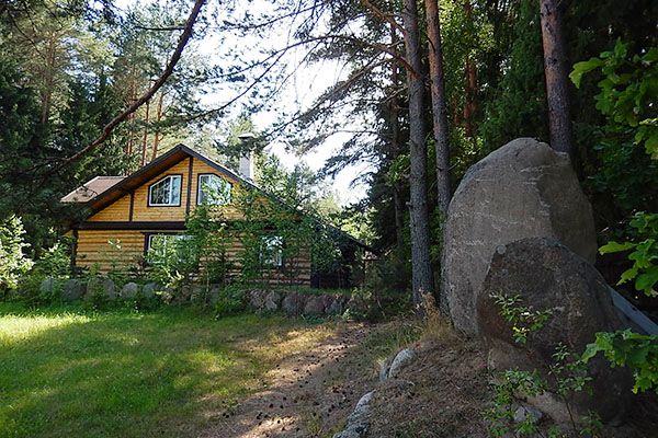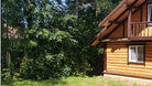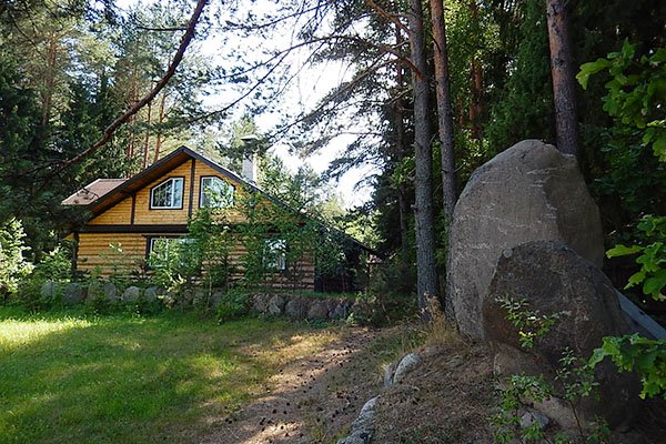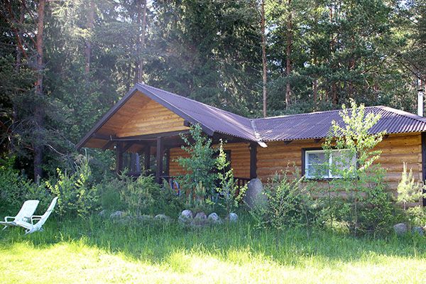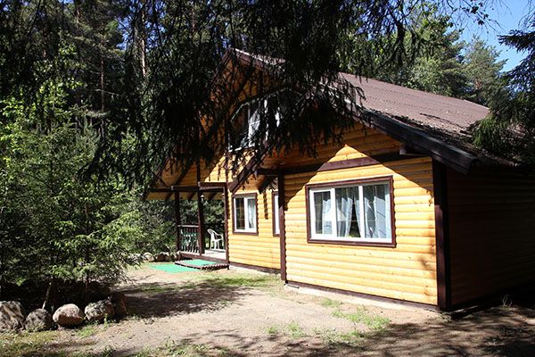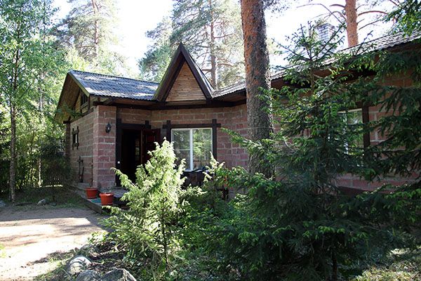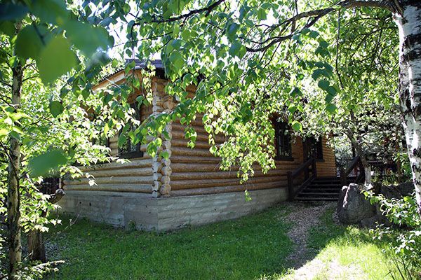 Уютный одноэтажный бревенчатый коттедж с небольшой крытой террасой по фасаду расположен на лесной опушке, в тени вековых сосен и елей.