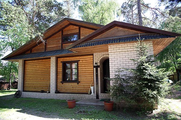 Уютный одноэтажный коттедж из бревна и кирпича с просторной крытой террасой по фасаду и камином в холле.
