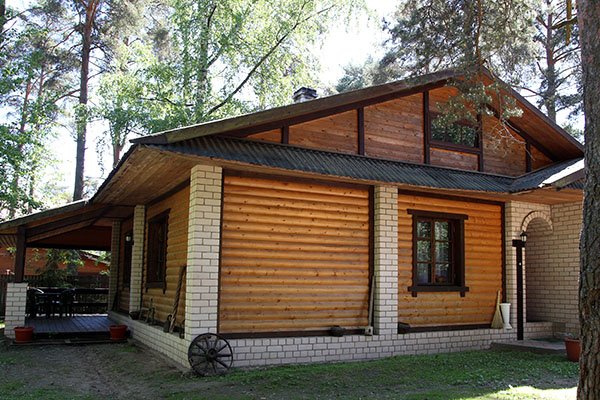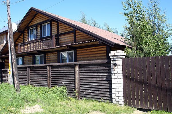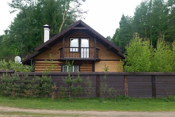 Уютный двухэтажный бревенчатый коттедж с небольшой крытой террасой по фасаду в окружении деревьев расположен на лесной опушке.