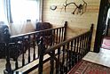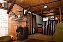 Просторный двухэтажный бревенчатый коттедж с широкой крытой террасой по фасаду и камином в холле.