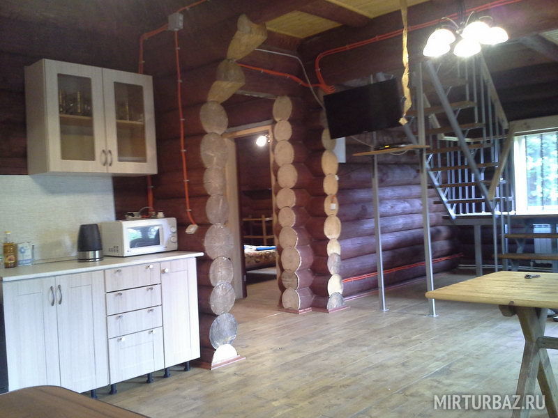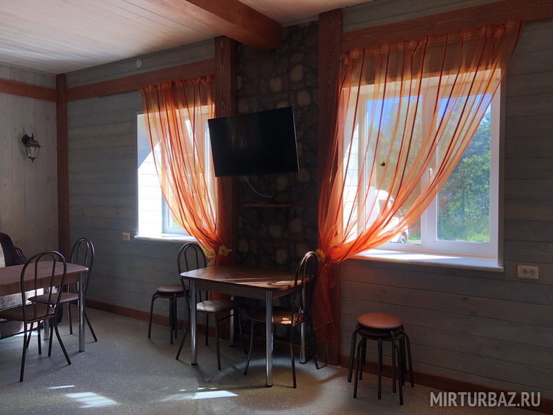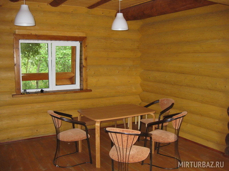 Короткий отпуск с друзьямиХорошее место с комфортным проживаниемОтдыхали компанией четыре дня. Снимали коттедж Январь. Стильный бревенчатый двухэтажный дом с удобной планировкой, огромной верандой, на которой даже в самый жаркий день прохладно, четырьмя спальнями и двумя санузлами. Приятный интерьер, есть все необходимое для комфортного проживания компании до 9 человек. На базе несколько коттеджей, стоят поодаль друг от друга, поэтому компании друг другу не мешают. Место красивое, до пляжа 30 метров, есть лежаки, заход нормальный, правда сам пляж маловат. На базе было мало людей, поэтому места хватало, но при полной загрузке разместиться будет негде. В гостиничном корпусе есть кафе, но мы там не ели, поэтому ничего сказать не могу. Интернет есть на территории, но неустойчивый.