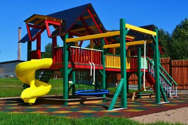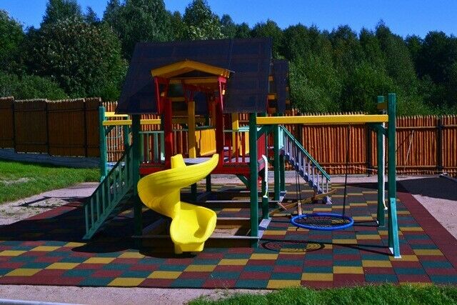 Для самых маленьких здесь построили большой детский городок с безопасным прорезиненным покрытием и множеством горок, качелей и веревочной лестницей.