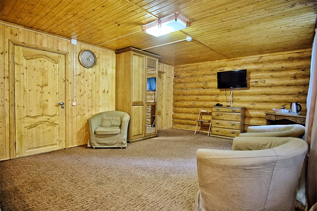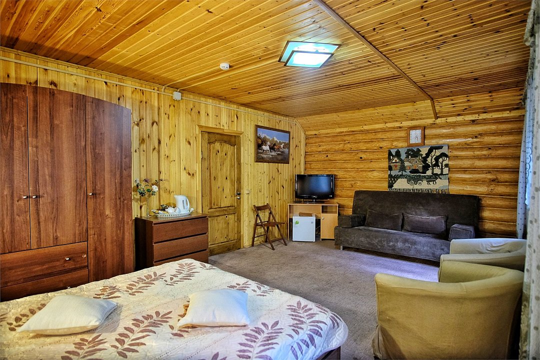 кабельное телевидение, фен, обогреватель, душевая кабина, биде, водонагреватель, теплый пол, банные полотенца, гигиенические средства, терраса, кровать «King size», две односпальные кровати, стулья, шкаф для одежды, вешалки, журнальный столик, зеркало, комод, две комнаты, чайный набор, чайник, унитаз, раковина, ковровое покрытие, отопление, отдельный вход в номер, внутренний телефон, телевизор с плоским экраном, москитная сеткаВ коттедже