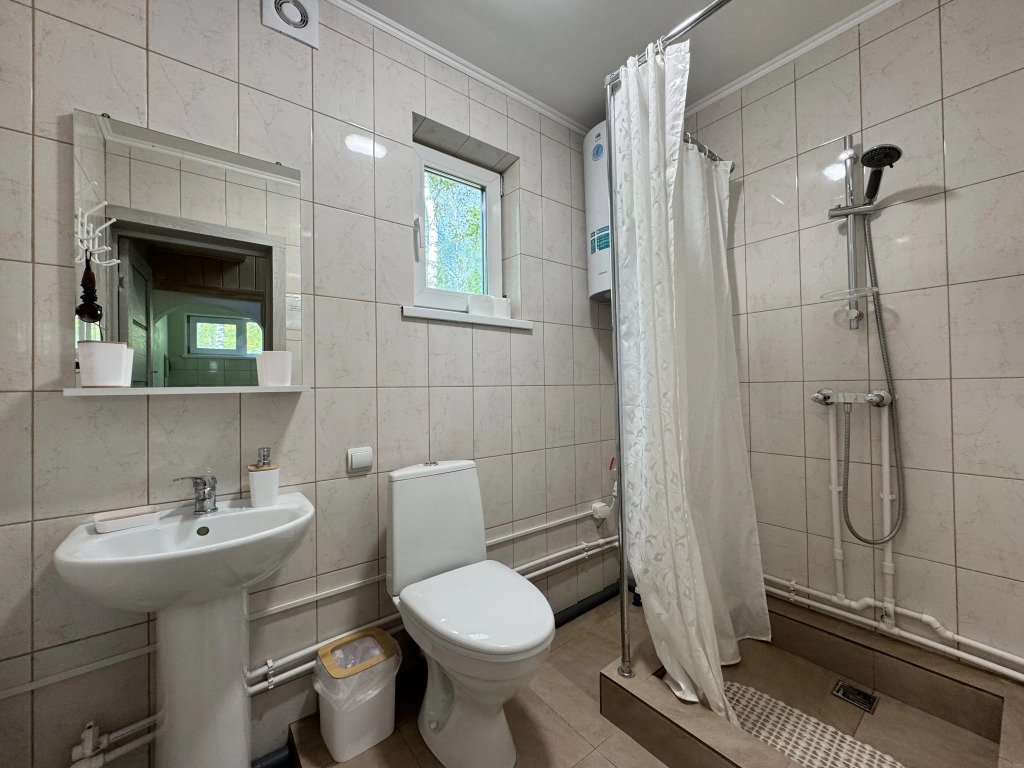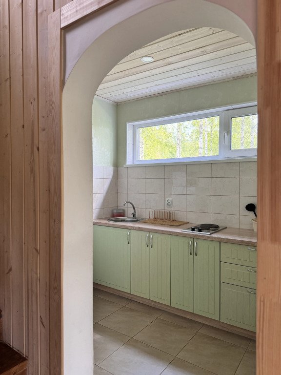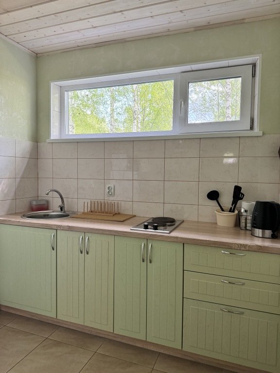 1-й этаж: гостиная с раскладным диваном (140×200 см), кухня с полным набором техники и посуды, санузел.