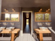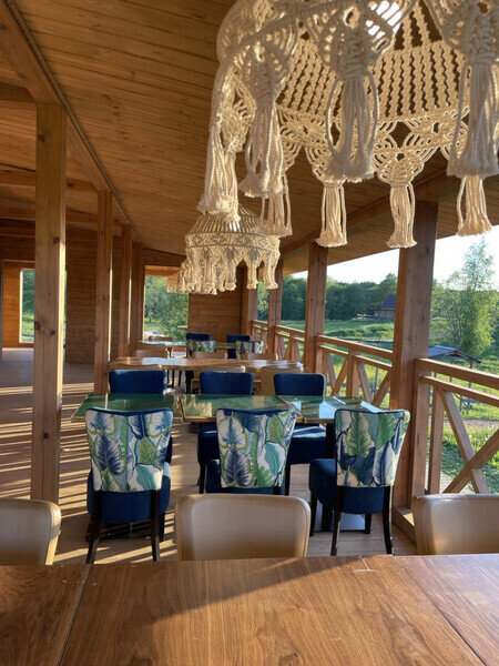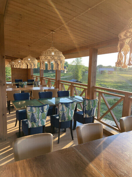 Во всех домах — деревянная мебель, выполненная их экологических материалов, есть мини-кухня, оборудованная необходимой посудой и техникой, камин, индивидуальный санузел. В глэмпингах же имеются удобные кровати, диван, есть терраса с плетенными креслами. Душевые и санузел общие, они распложены на территории.