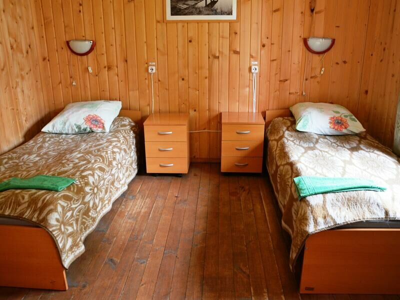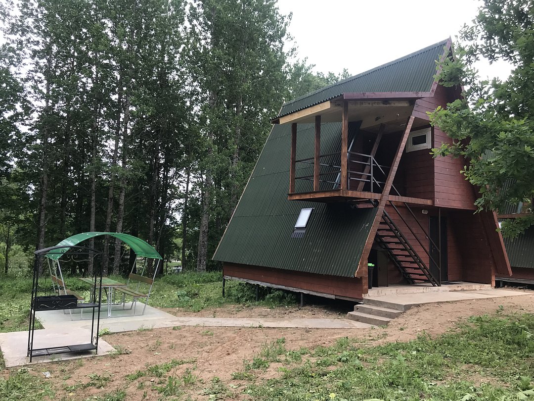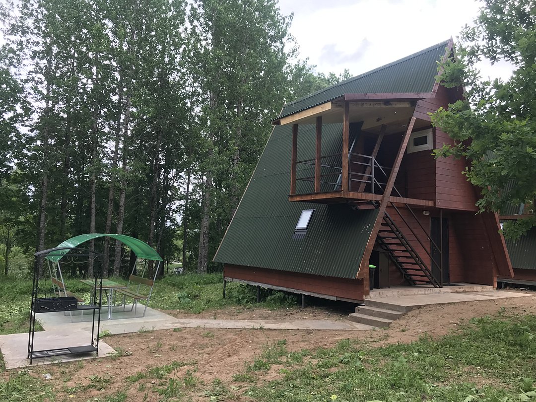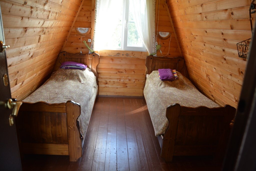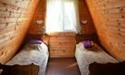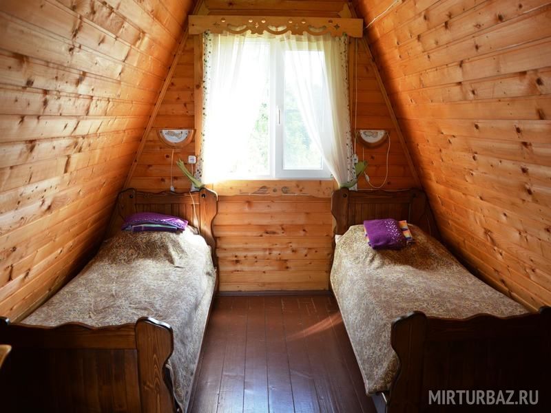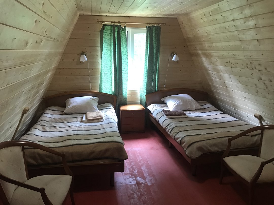 Двухкомнатный двухместный номер с дополнительным спальным местом на втором этаже с видом на территорию базы отдыха.