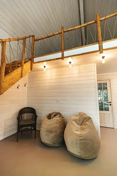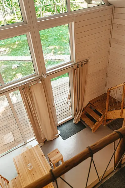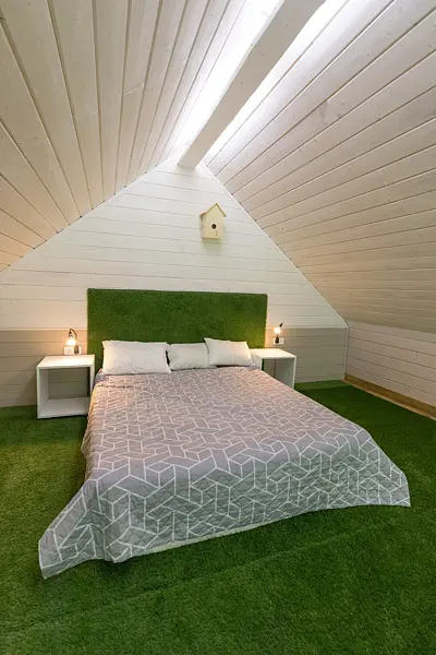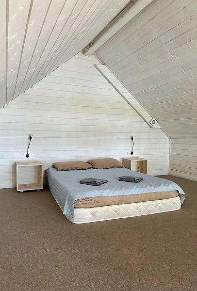 На втором этаже спальная комната с двуспальной кроватью-матрасом. В каждом домике теплые полы, постельное белье, полотенца, фумигаторы и средства от комаров. Также имеется веранда с креслами и столом, панорамное остекление. Около домика оборудована мангальная зона, предоставляются шампуры и решетка.