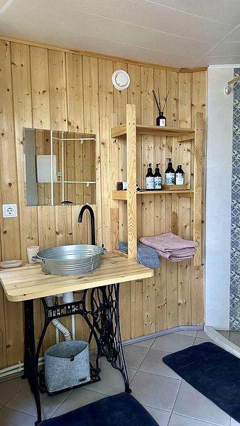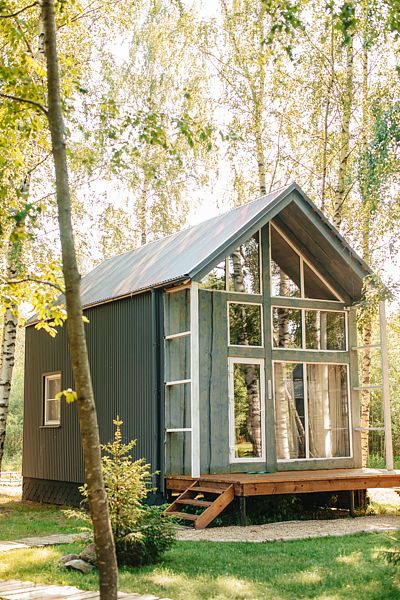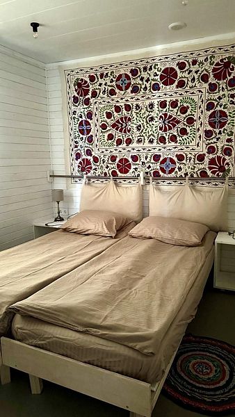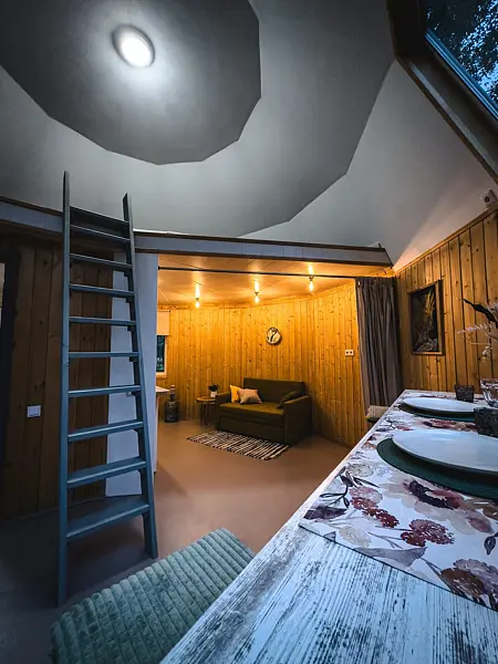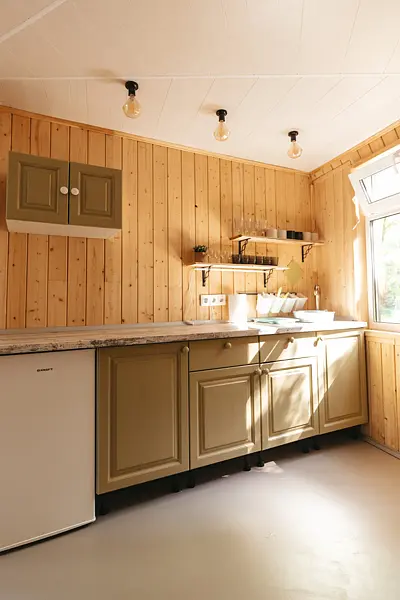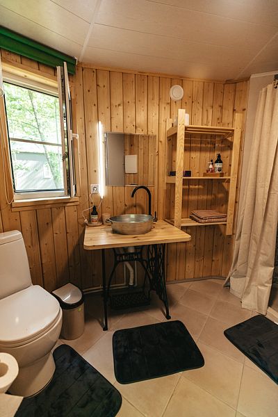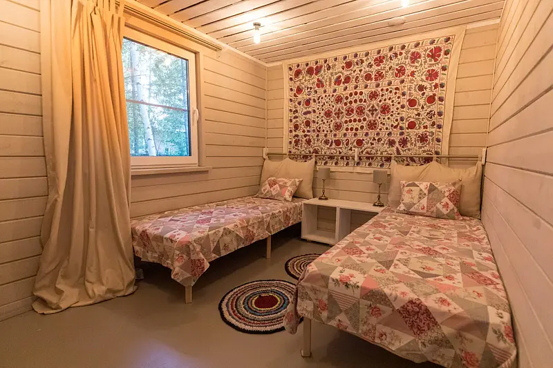 В домике на первом этаже: мини-кухня (холодильник, электроплитка, посуда для приготовления и сервировки, электрочайник), ванная комната (душ, туалет, умывальник, горячая вода, полотенцесушитель, гигиенические принадлежности), спальная комната с 2 односпальными кроватями (возможно трансформировать в большую двуспальную кровать), обеденный стол.