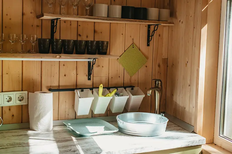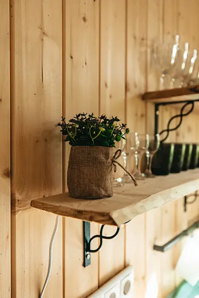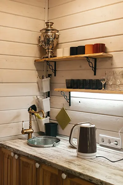 В домике на первом этаже: мини-кухня (холодильник, электроплитка, посуда для приготовления и сервировки, электрочайник); 1,5-спальный диван; барная стойка с панорамным видом на Волгу; ванная комната (туалет, душ, умывальник, горячая вода, полотенцесушитель, гигиенические принадлежности).