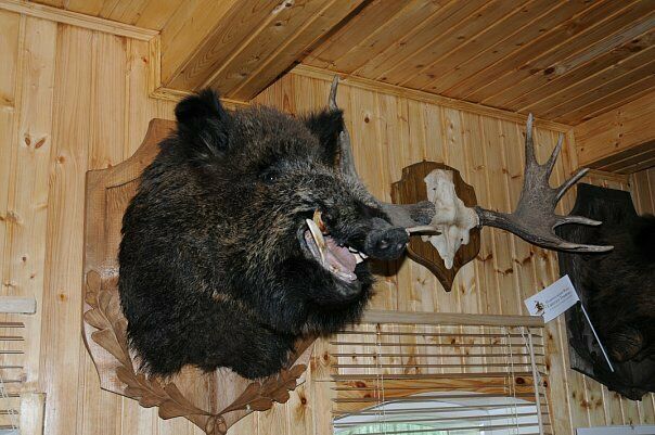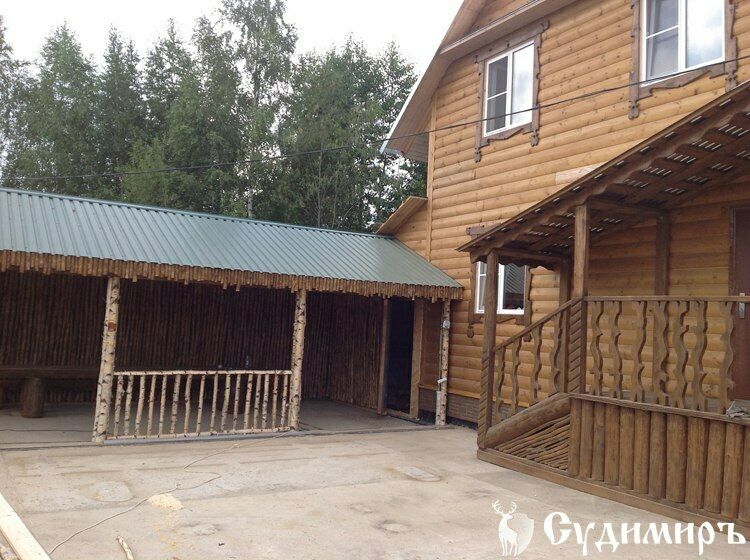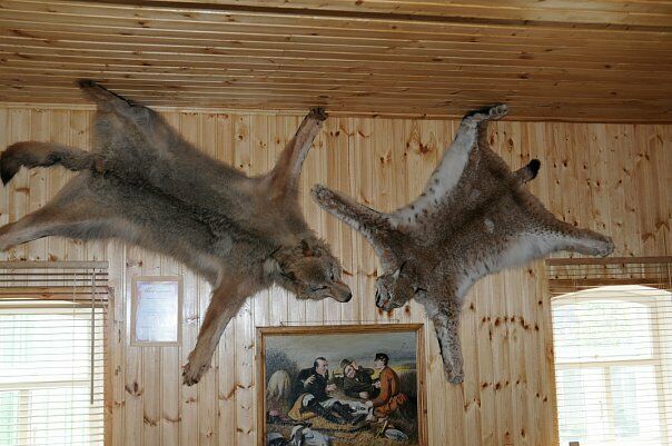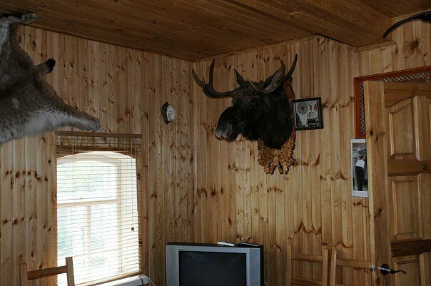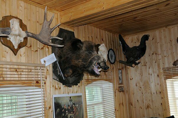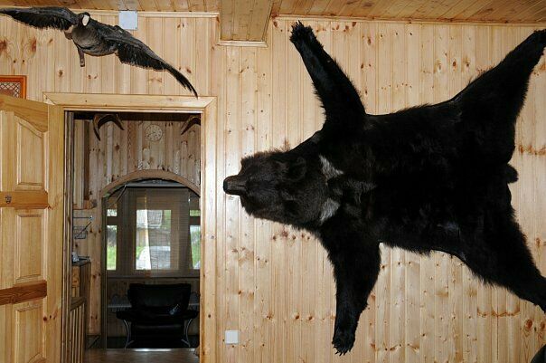 Дом подстроен с использованием натурального дерева и оформлен в охотничьем стиле.