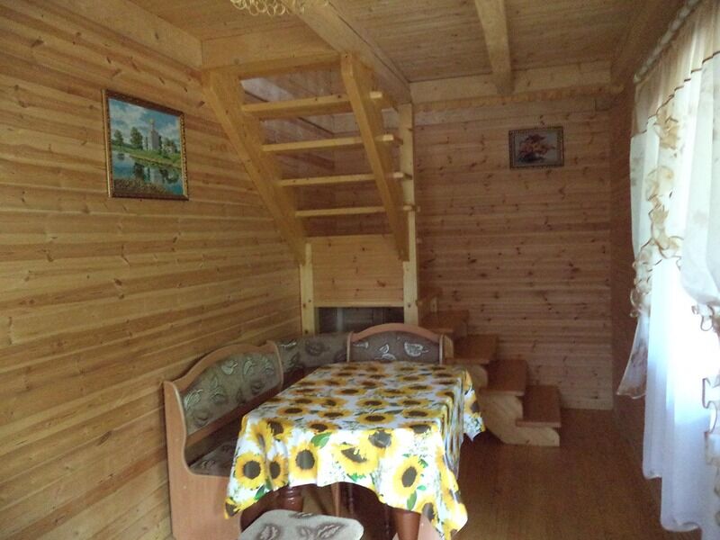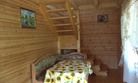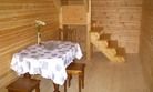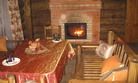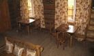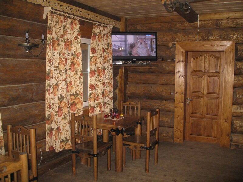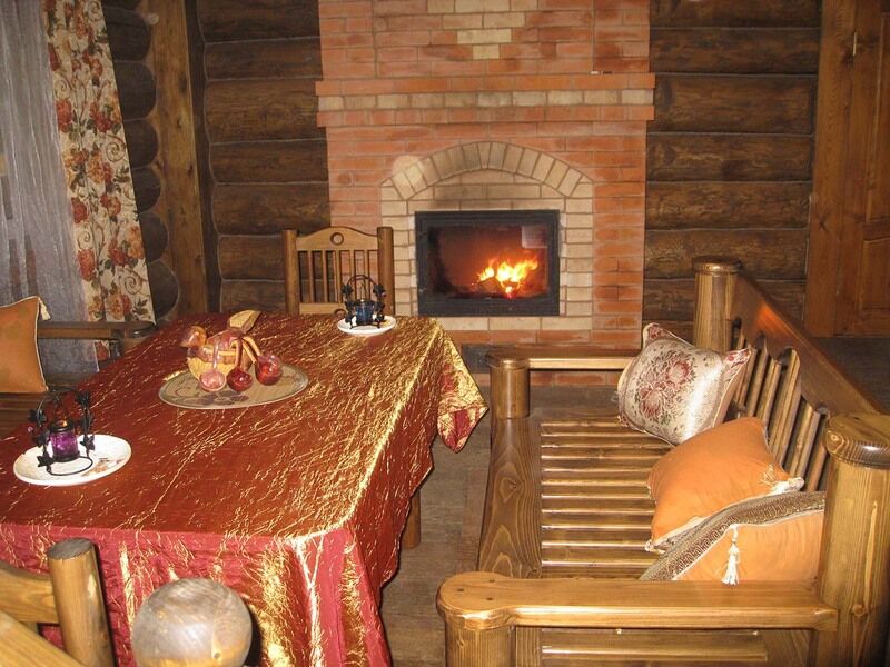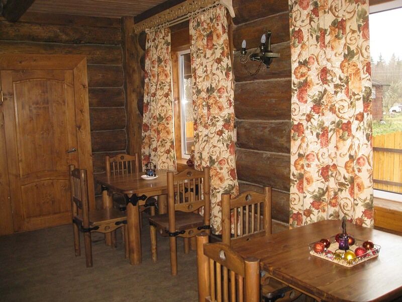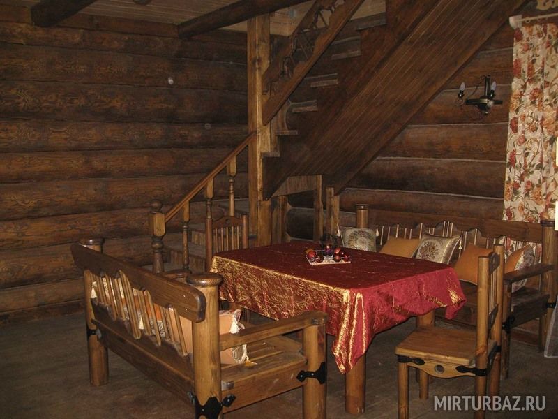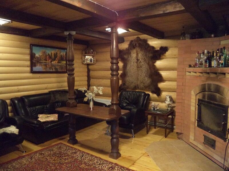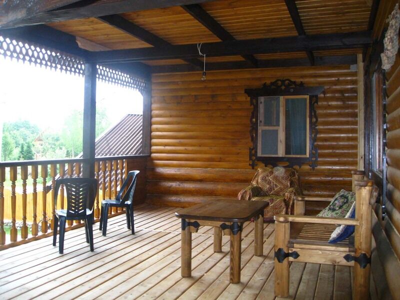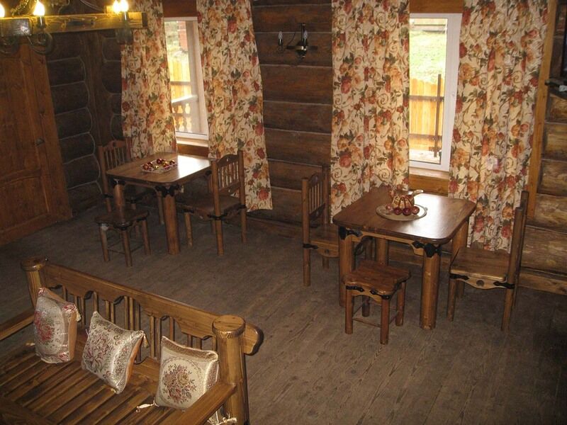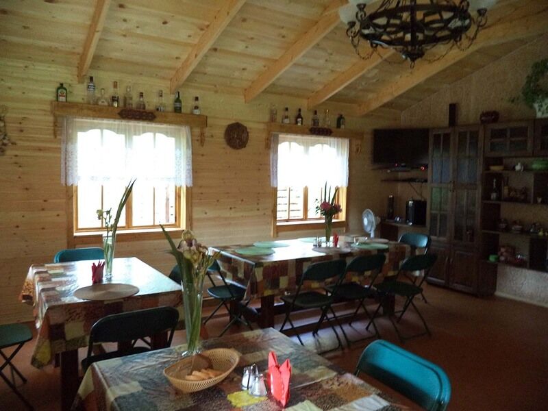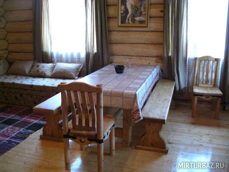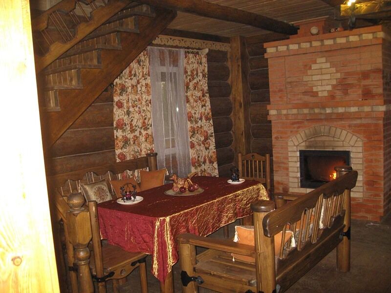Первый этаж — большой каминный зал в стиле деревенского кафе (камин-печь, дубовые столы со скамьями, спутниковое телевидение), просторная оборудованная кухня с кирпичной печью, одна спальня, санузел, стиральная машина, очень просторная открытая веранда с деревянной и пластиковой мебелью.