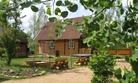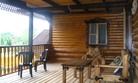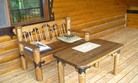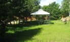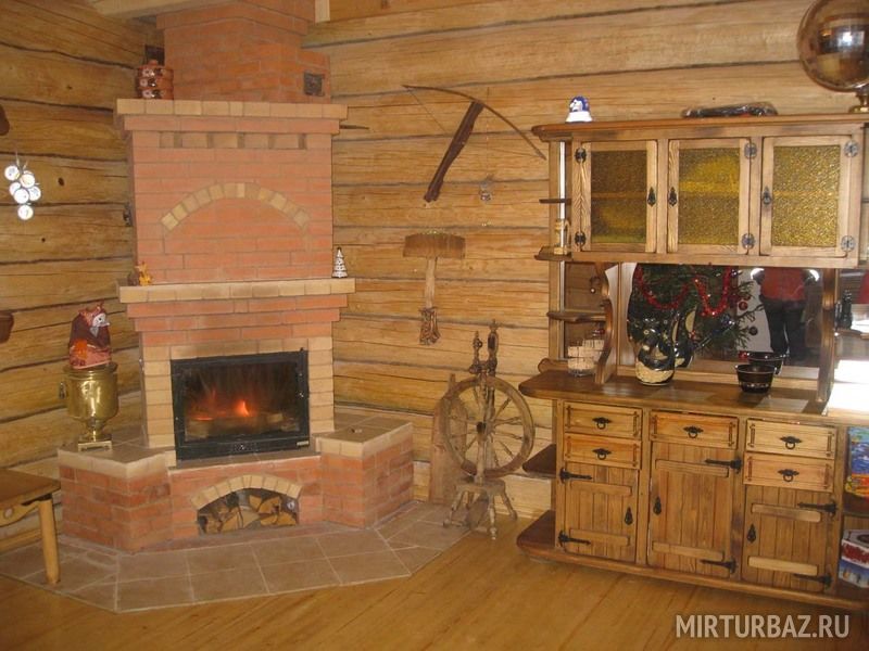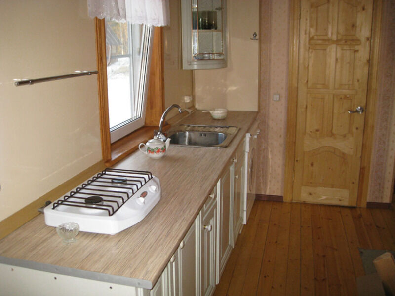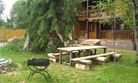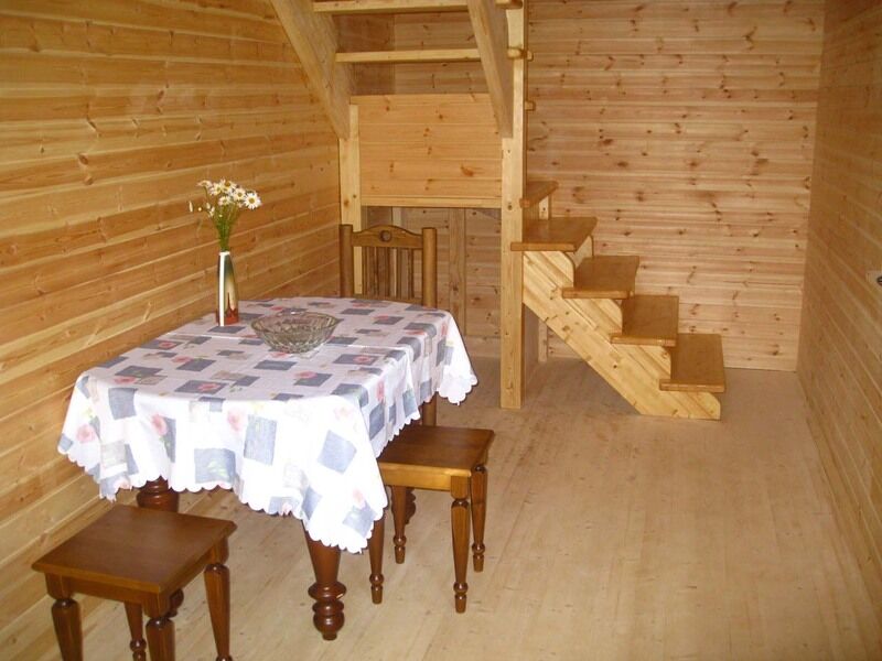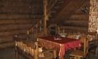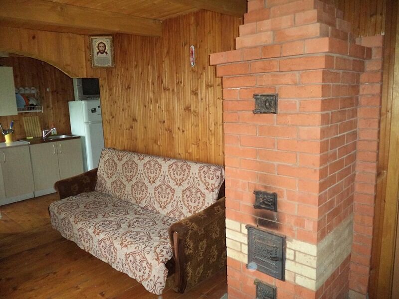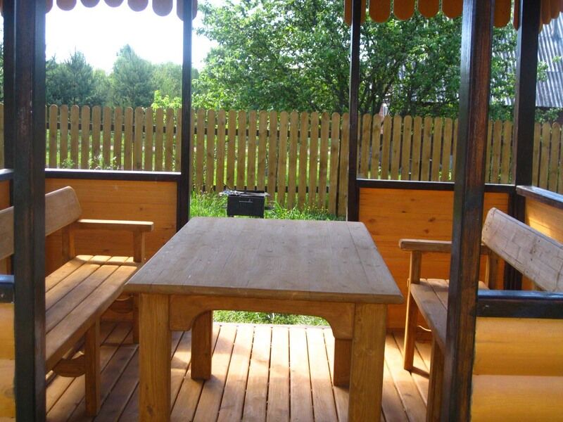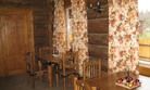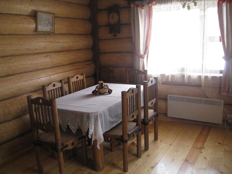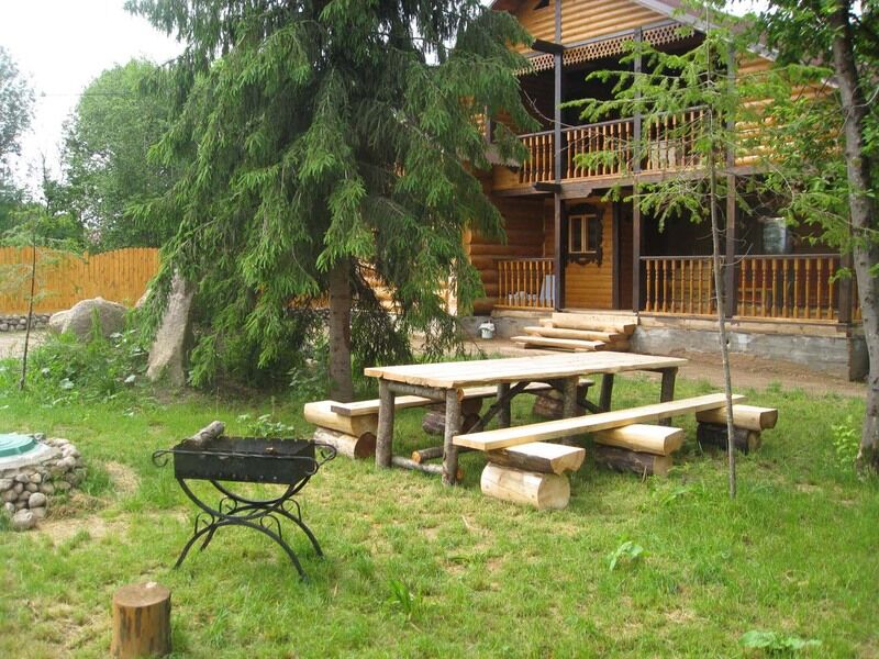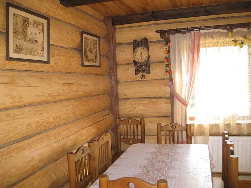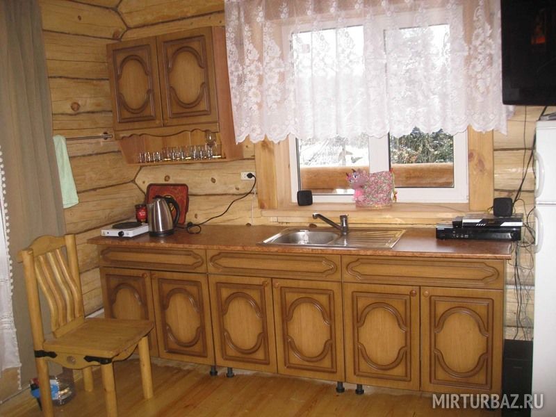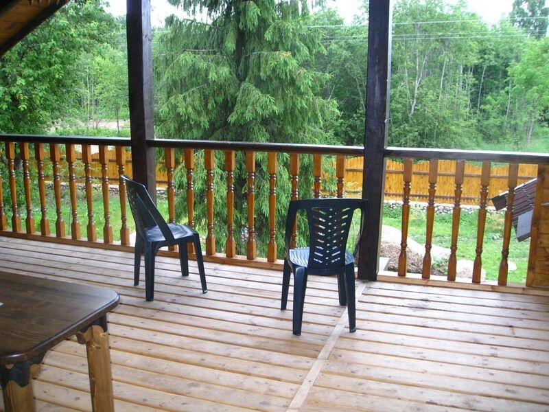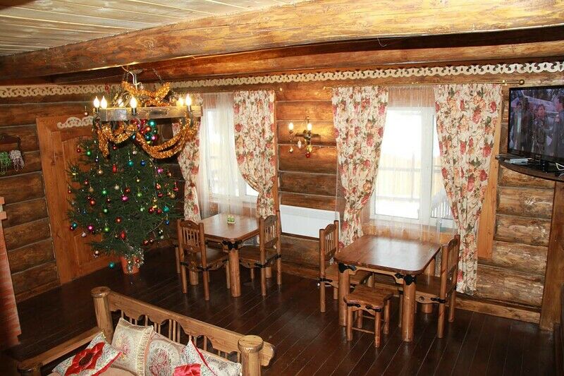Первый этаж — большой каминный зал в стиле деревенского кафе (камин-печь, дубовые столы со скамьями, спутниковое телевидение), просторная оборудованная кухня с кирпичной печью, одна спальня, санузел, стиральная машина, очень просторная открытая веранда с деревянной и пластиковой мебелью.