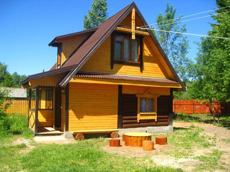 Первый этаж — просторная спальня-студия (печь, двуспальная кровать, мягкий гарнитур, разборный диван, буфет, телевизор, шкаф), веранда-столовая, полностью оснащённая кухня, санузел с душевой кабиной.
