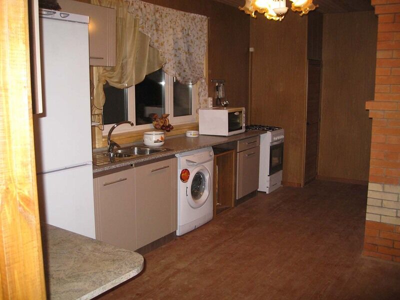 Первый этаж — большой каминный зал (камин-печь, кожаные диван и 4 уютных кресла, мраморные столики, спутниковое телевидение), просторная оборудованная кухня-столовая, 2 спальни, санузел с душевой кабиной, стиральной машиной, просторная открытая веранда с пластиковой мебелью.