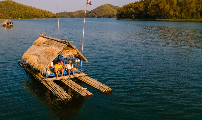 В глэмпинге построили большой, просторный и безопасный плот. Сделали навес от солнца или внезапных осадков, установили двигатель и организовали лаунж-зону на палубе с мебелью, музыкой и барбекю. А дальше хоть куда — на рыбалку, на пикник, в путешествие.