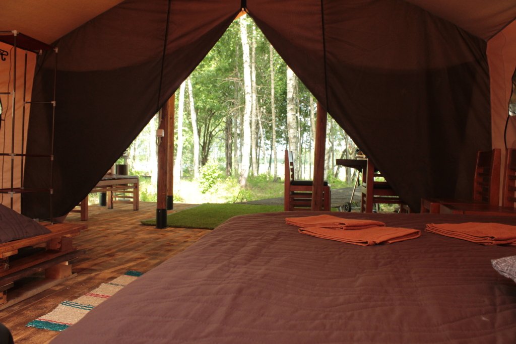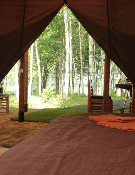Лагерь предлагает 10 уютных домиков, откуда открывается потрясающий вид на лесистые окрестности и озеро Селигер, каждый из которых способен разместить до 4-х человек. Комфортные условия проживания дополняются теплыми душевыми и туалетными комнатами, которые находятся в отдельно стоящем строении на территории.