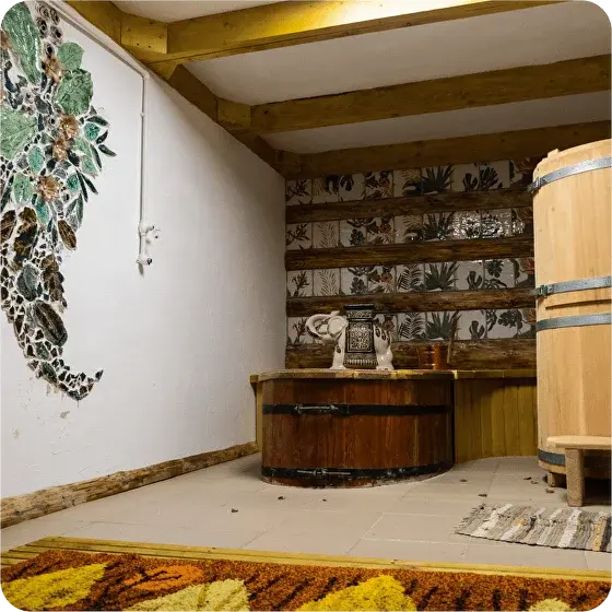 В уютном погребке гости могут спрятаться от жары или холода для дегустации сыра с сыроварни и привозного заморского вина, или просто уединится с чаепитием и настольными играми.