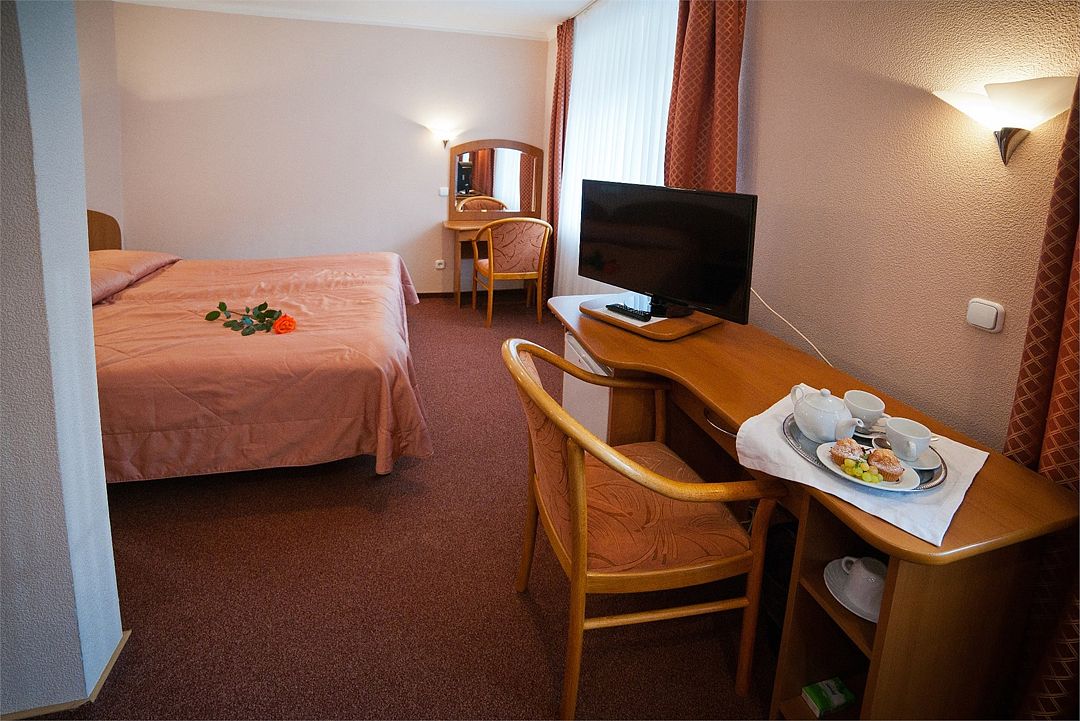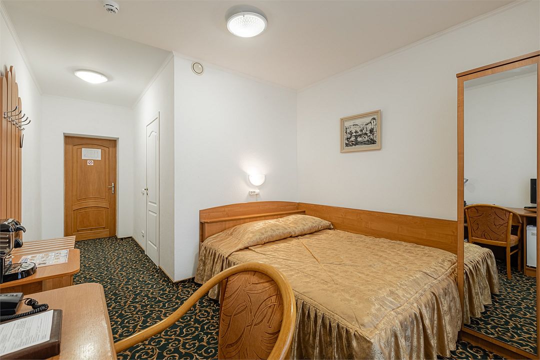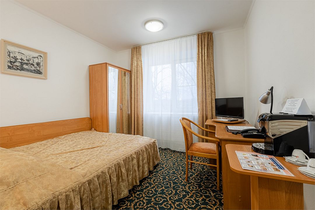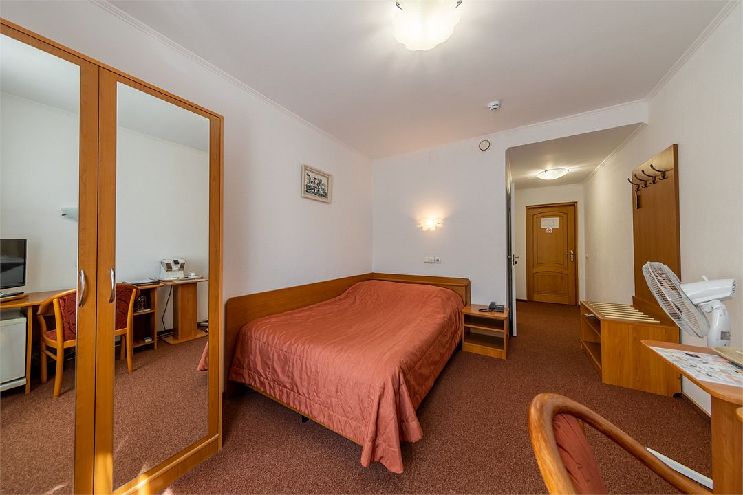 Номер на четвертом (мансардном) этаже отеля. Имеет все необходимое для работы и отдыха: кровать шириной один метр шестьдесят сантиметров, рабочий стол, телевизор, шкаф для одежды и прочее. Санузел оснащен душевой кабиной.