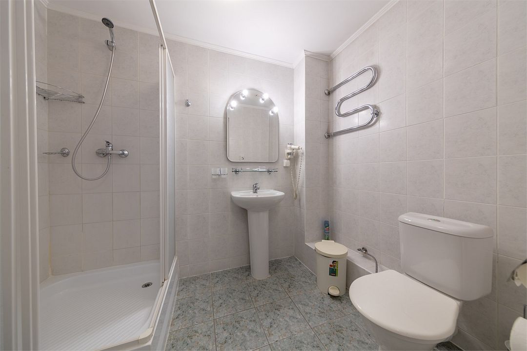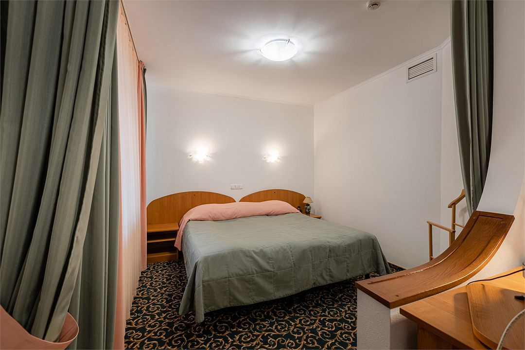 2х-комнатный номер на мансардном этаже. Чистый, с 2х-спальной кроватью в спальне и раскладным диваном в гостиной. Мини-холодильник, тв. В ванной душевая кабина, есть фен. Одноразовые шампунь и гель для душа в ванной комнате оставляют. Зубные щетки, бритвенные принадлежности можно приобрести на ресепшен.