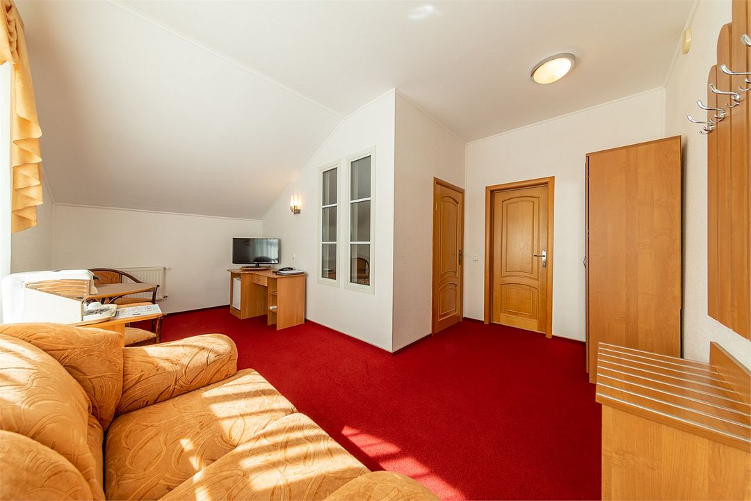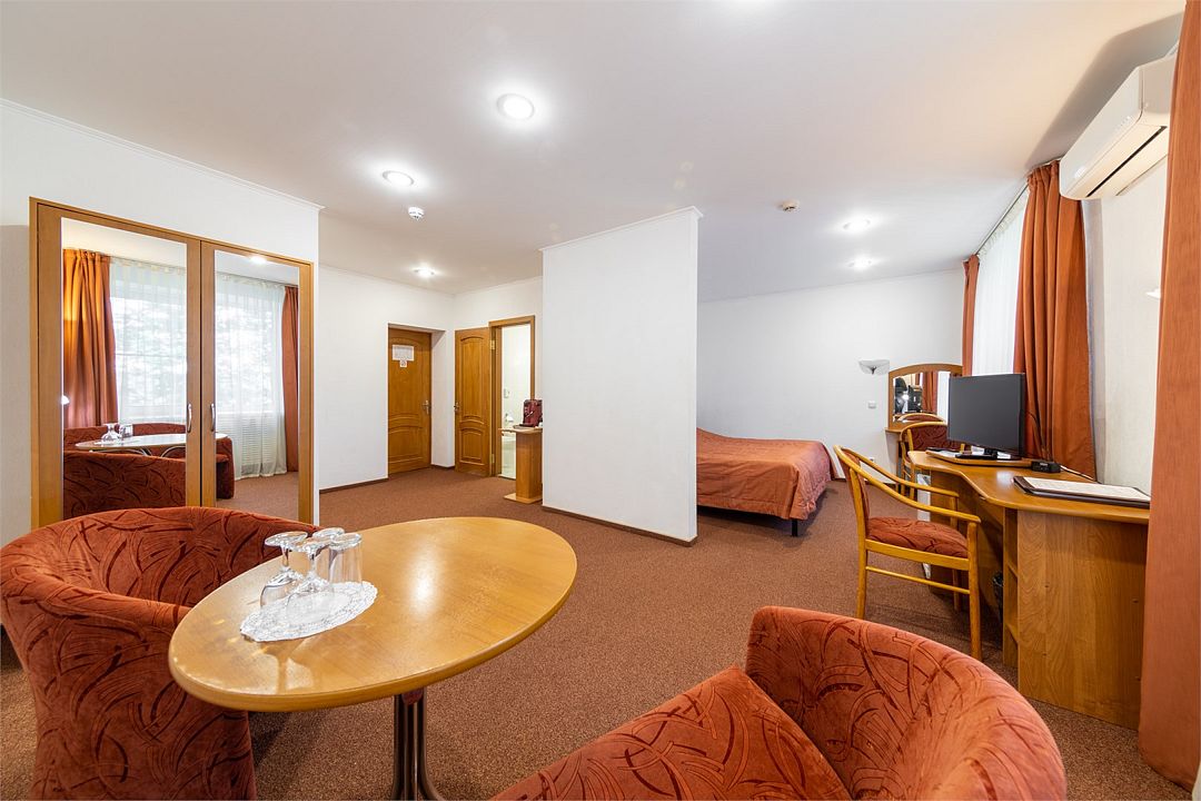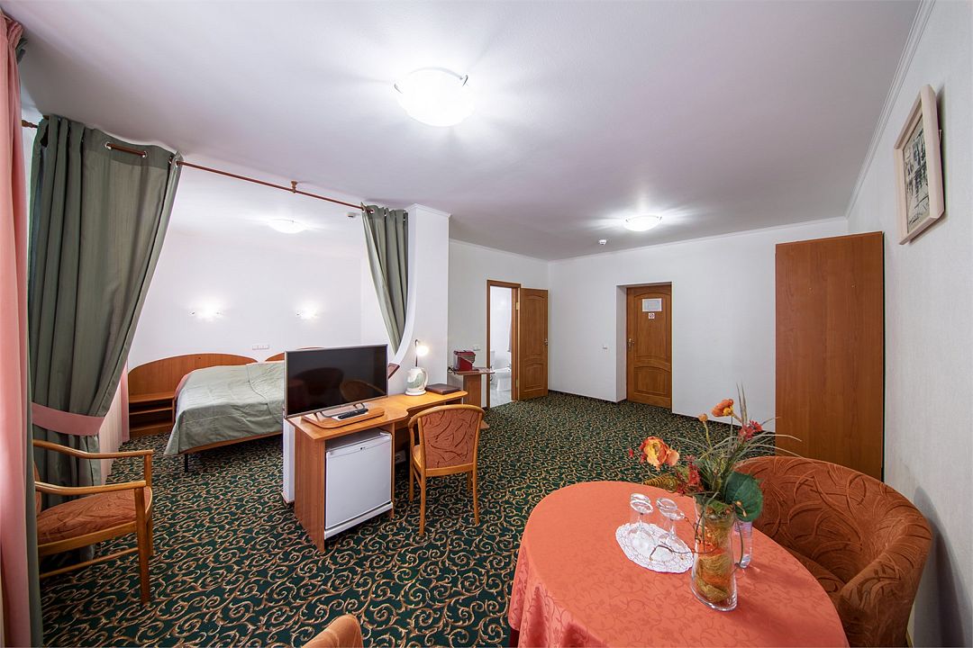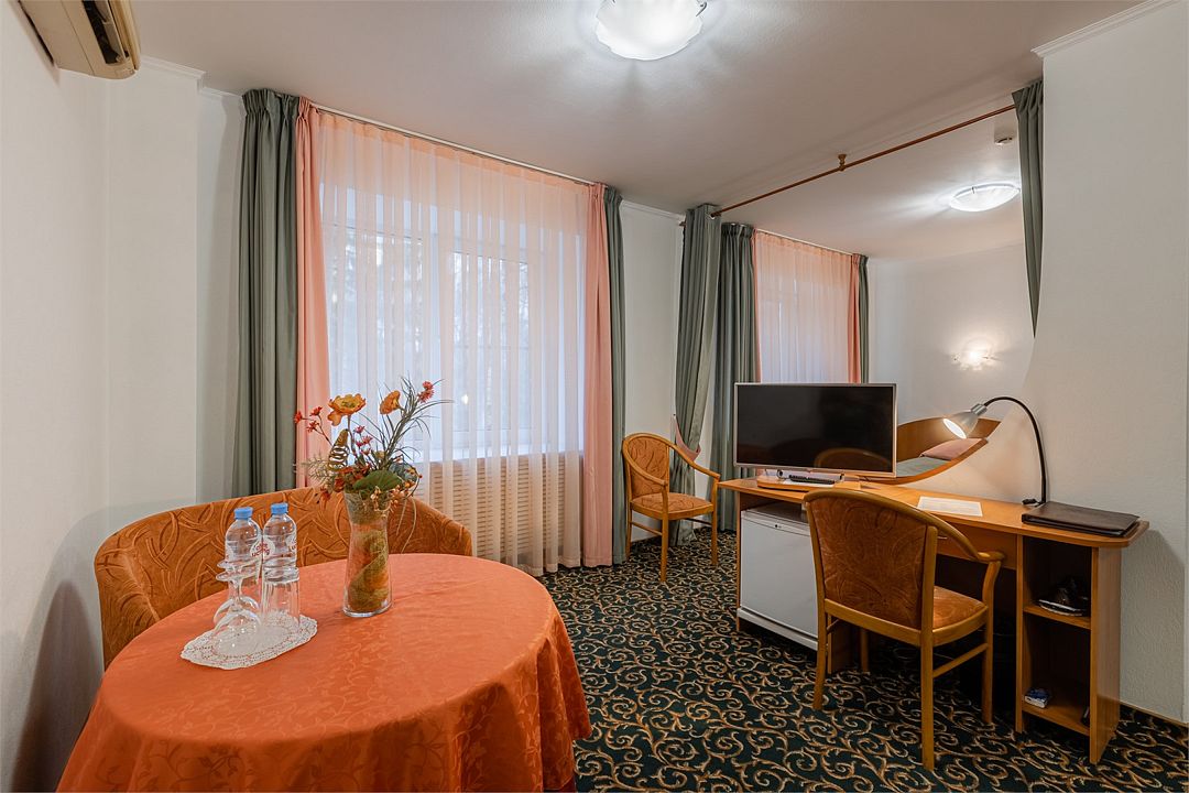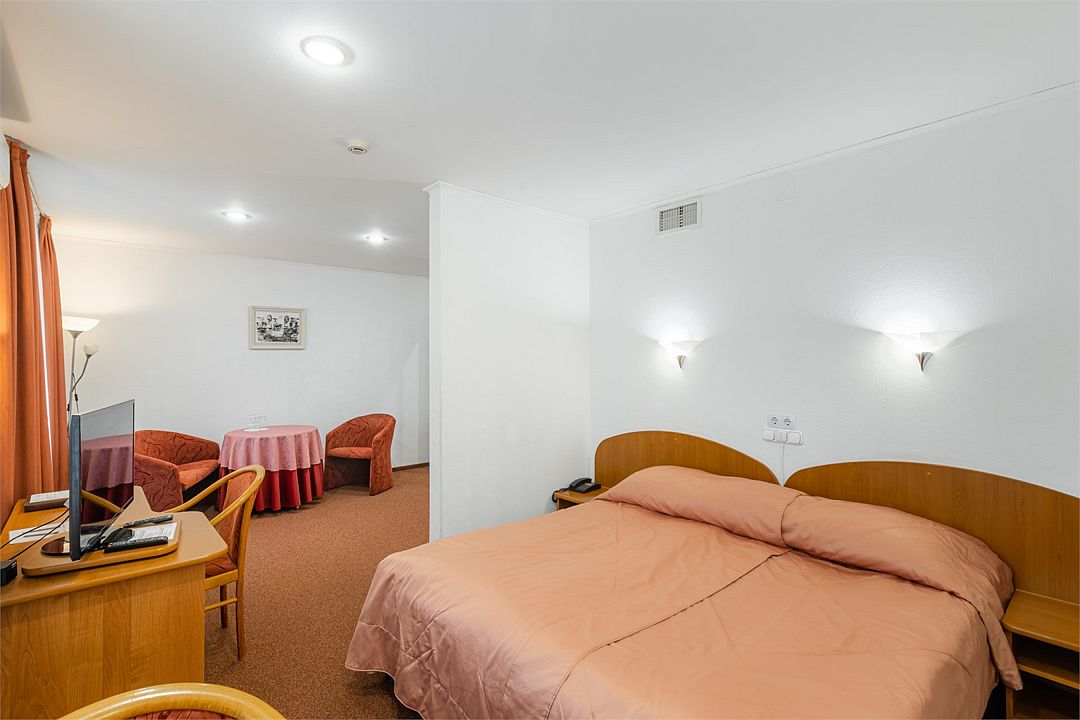 Двухкомнатный двухместный номер категории «Джуниор сюит» находится на мансардном четвертом этаже отеля. Большая кровать «Queen size», гостевая комната с раскладывающимся одноместным диваном идеально подойдут для семейных пар, путешествующих с ребёнком.